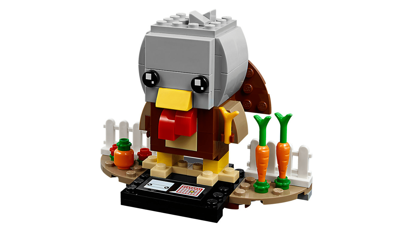 Buildable LEGO® BrickHeadz™ Thanksgiving Turkey construction character features a yellow beak, brown wings and a detachable carrot.