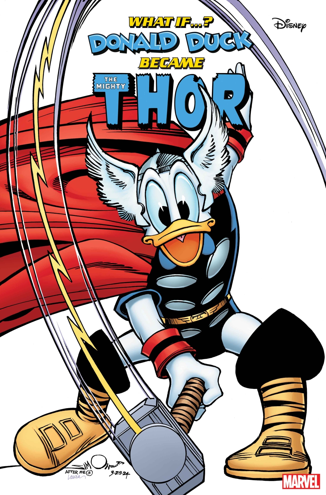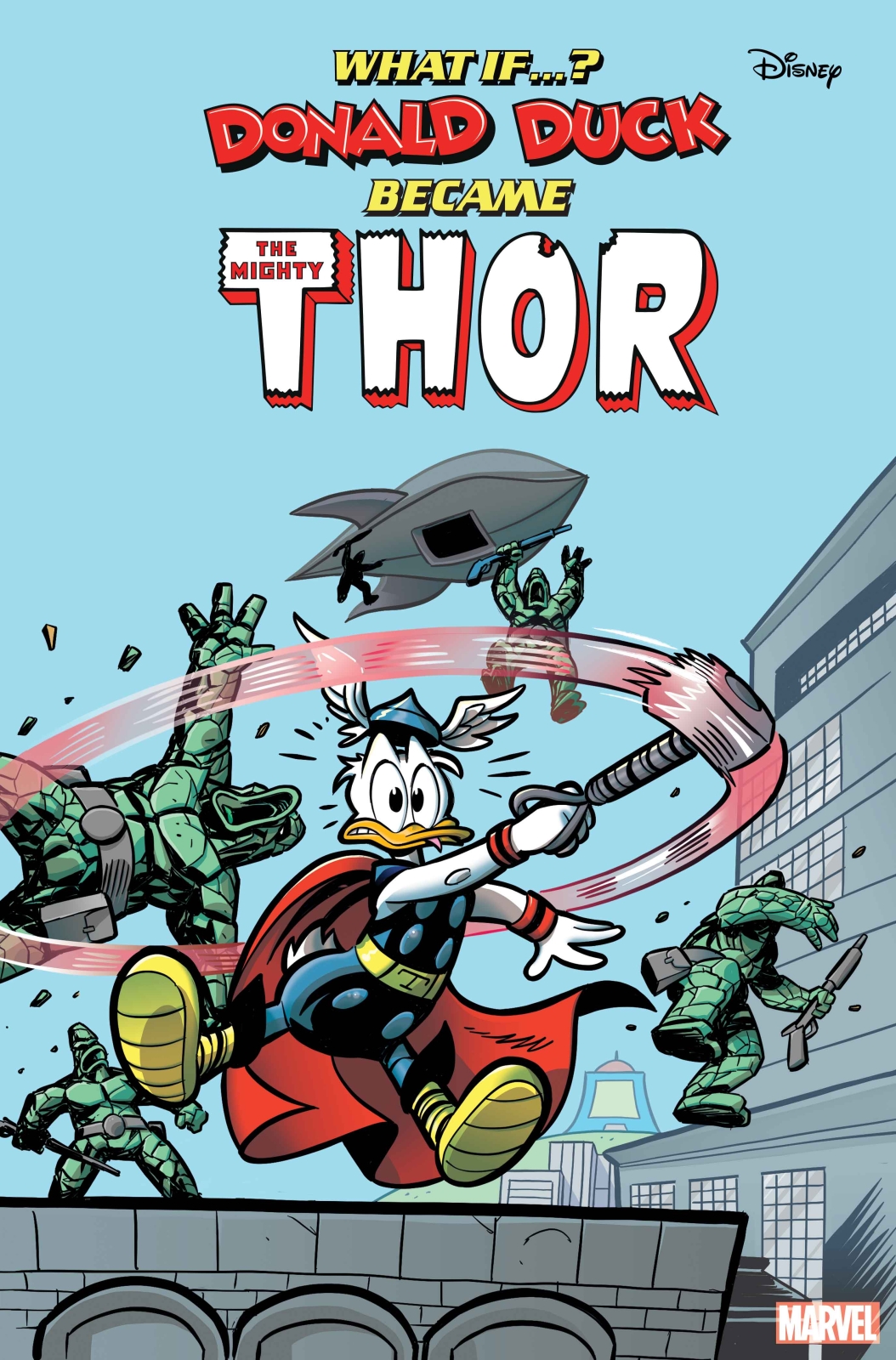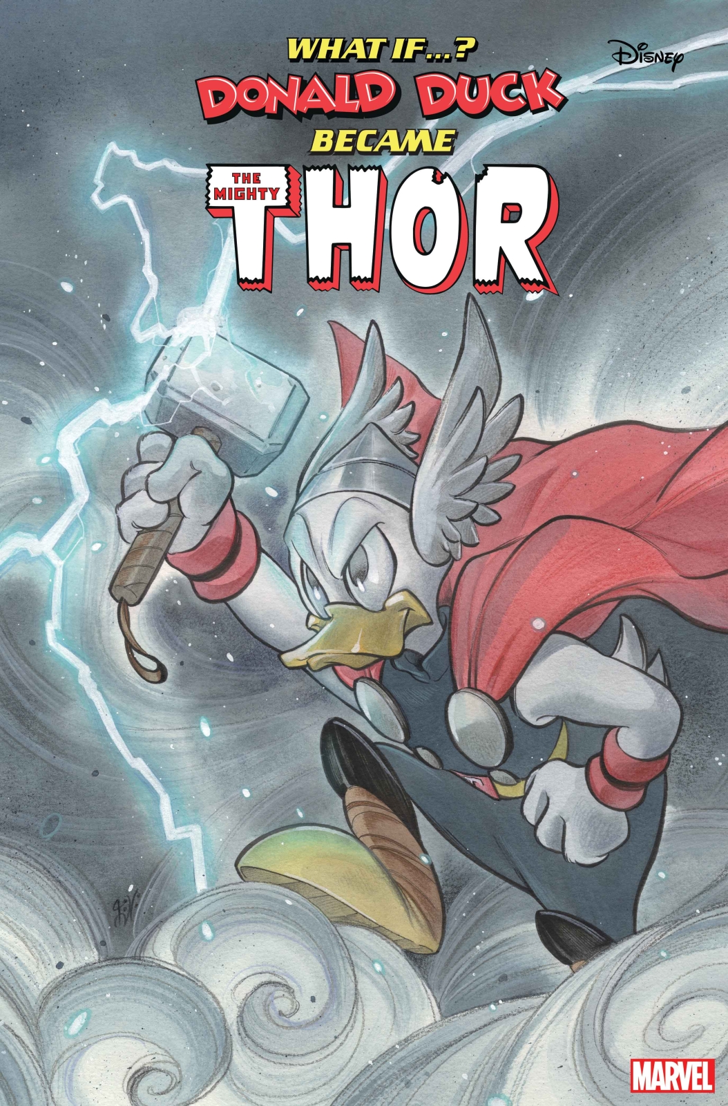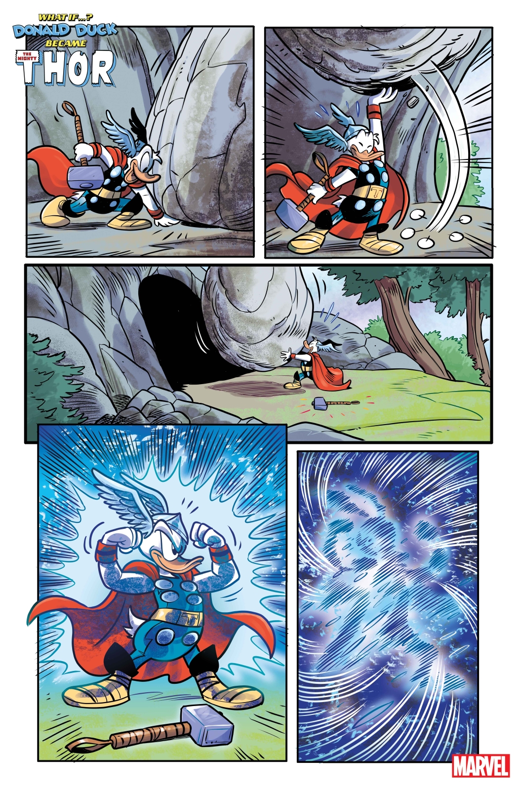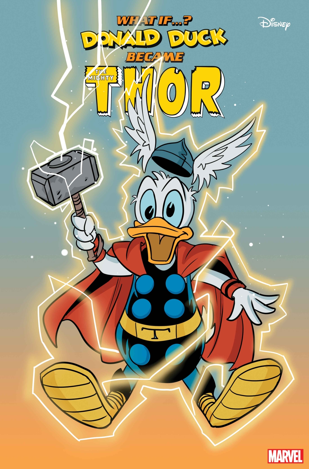 IS THIS FOWL WORTHY OF THE HAMMER OF THOR?! When Donald Duck chaperones Huey, Dewey and Louie on an archaeological trip to search for ancient Viking artifacts, he finds more than he bargained for! He comes across the Stone Ducks from Saturn preparing for an invasion. But everything changes when he discovers an enchanted cane that causes an egg-ceptional transformation, gifting him with the POWER OF THOR! Can he learn how to use his new abilities in time to save Duckburg before he changes back? Find out in this mind-twisting retelling of the Mighty Thor’s thunderous origin!