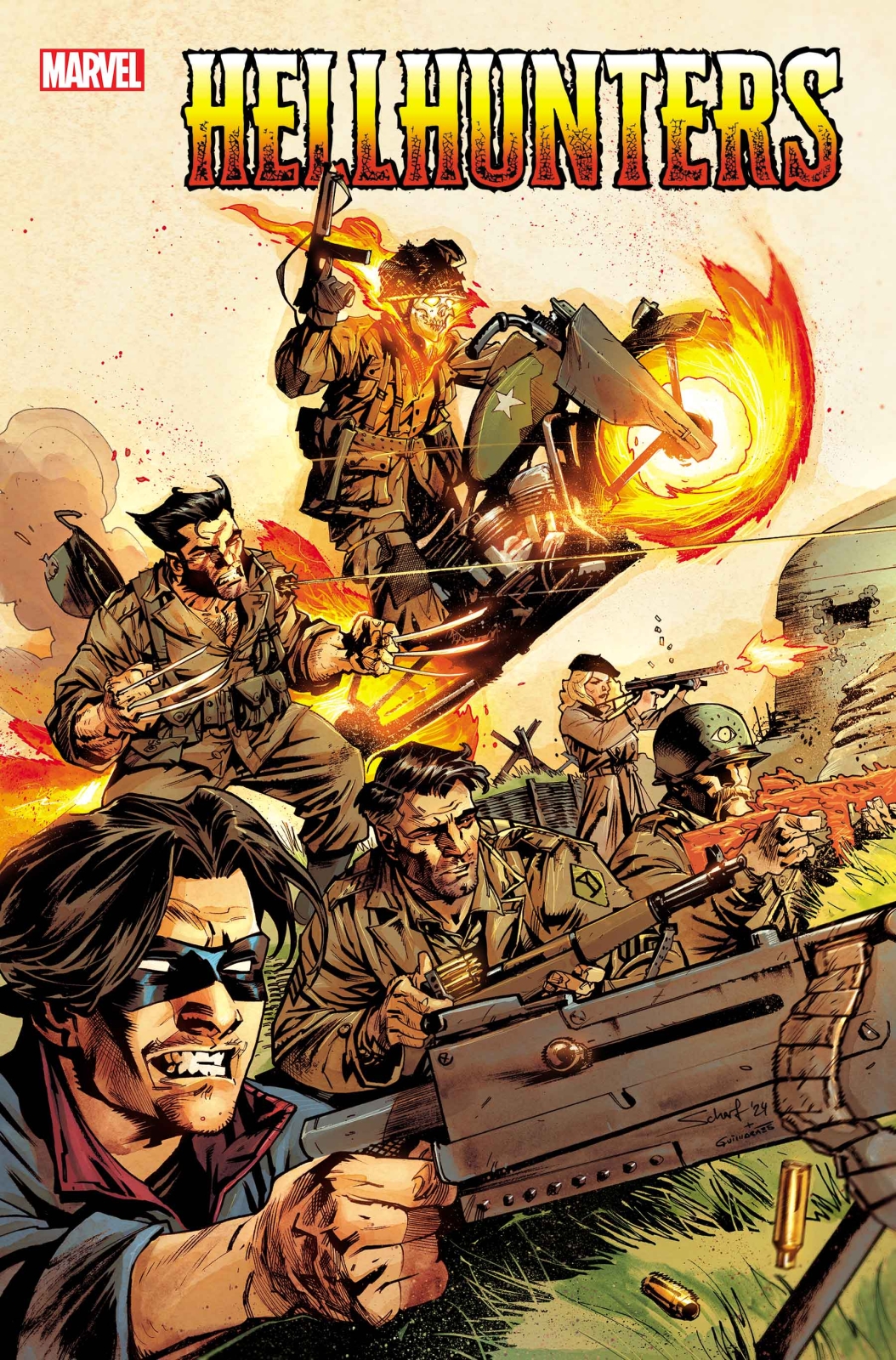 Marvel is set to return to the battlefields of World War II to explore the origin of Sergeant Sal Romero, a.k.a. Ghost Rider ’44, in Hellhunters, a five issue limited series from writer Phillip Kennedy Johnson (Incredible Hulk) and artist Adam Gorham (Star Wars: Darth Vader) and featuring appearances by the likes of Wolverine, Nick Fury, Peggy Carter, Bucky Barnes and Soldier Supreme.