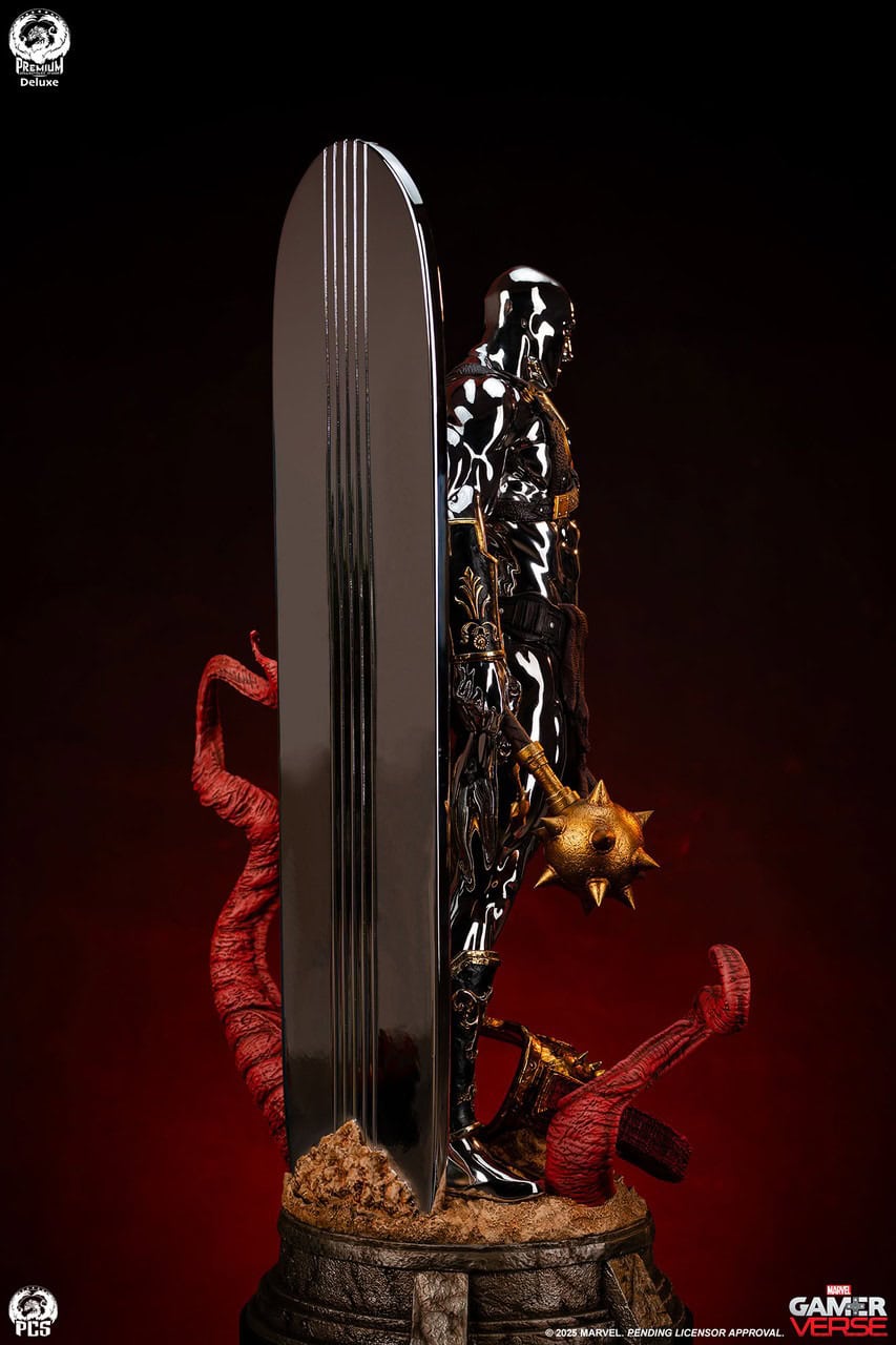 The Silver Surfer himself is covered in a dazzling, reflective chrome finish from head to toe. The finish appears even brighter when set against the battle worn armor and weapons he is adorned with. In his right hand he wields a spiked mace while behind him his iconic surfboard, fashioned into a makeshift shield, juts out from the base which has been sculpted with a realistic sand-like texture to recreate the feel of the harsh terrain.