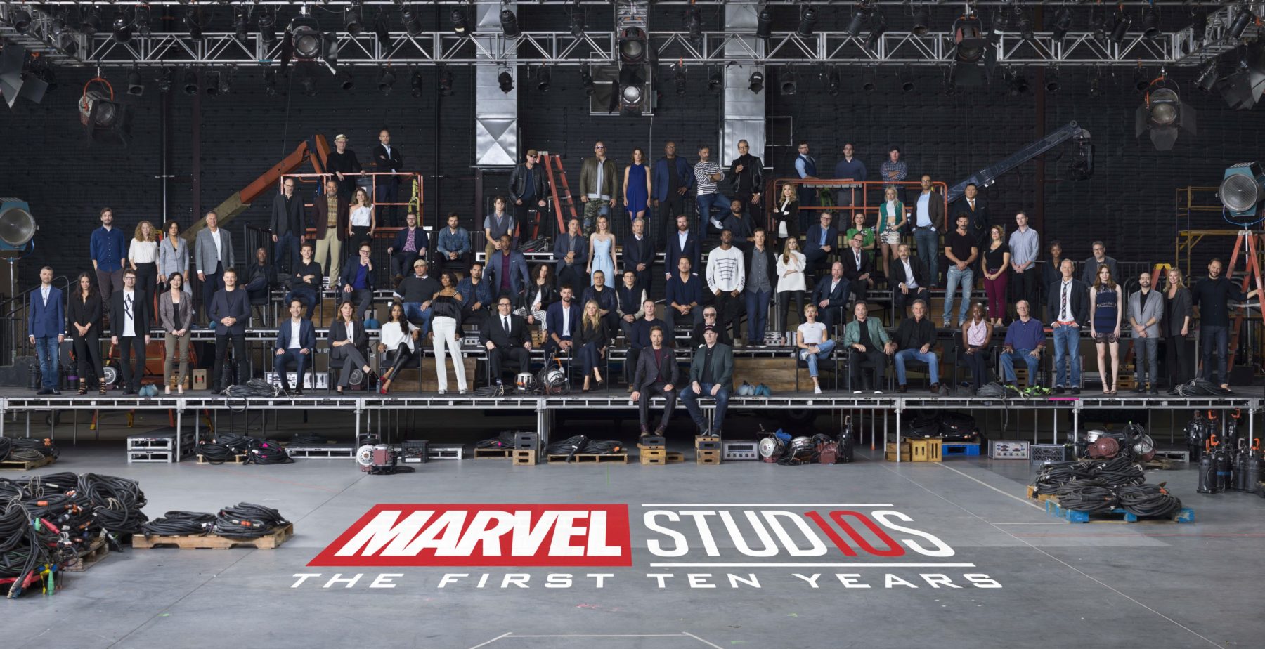 Appearing in the large photo is Robert Downey Jr., Chris Evans, Chris Hemsworth, Mark Ruffalo, Scarlett Johansson, Paul Rudd, Benedict Cumberbatch, Chris Pratt, Chadwick Boseman, Brie Larson, Jeremy Renner, Tom Holland, Sean Gunn, Hannah John-Kamen, Zoe Saldana, Angela Bassett, Jon Favreau, Gwyneth Paltrow, Kurt Russell, Danai Gurira, William Hurt, Karen Gillan, Emily VanCamp, Tessa Thompson, Don Cheadle, Dave Bautista, Michael Peña, Anthony Mackie, Evangeline Lilly, Elizabeth Olsen, Paul Bettany, Frank Grillo, Letitia Wright, Laurence Fishburne, Linda Cardellini, Sebastian Stan, Ty Simpkins, Michael Douglas, Michelle Pfeiffer, Hayley Atwell, Pom Klementieff, Benedict Wong, Michael Rooker, Vin Diesel, Cobie Smulders, Samuel L. Jackson, Jeff Goldblum, Kevin Feige, Louis D’Esposito, Victoria Alonso, Stan Lee, Scott Derrickson, Trinh Tran, Alan Taylor, Brad Winderbaum, Louis Letterier, Jon Watts, Sarah Finn, James Gunn, Joe Russo, Anthony Russo, Joss Whedon, David Grant, Mitchell Bell, Anna Boden, Ryan Fleck, Jeffrey Ford, Peyton Reed, Jonathan Schwartz, Stephen Broussard, Ryan Coogler, Jeremy Latcham, Nate Moore, Christopher Markus, Stephen McFeely, Taika Waititi, Erik Carroll, Ryan Meinerding and Craig Kyle.