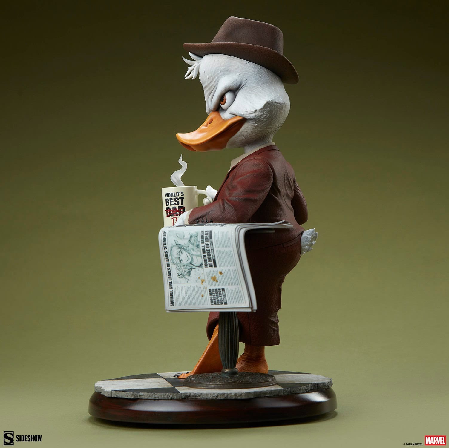 The polystone Howard the Duck Premium Format™ Figure measures 11” tall x 7” wide x 7.2” deep, inspired by his appearance in Marvel Comics. He wears a brown sculpted detective suit, complete with a cutout for his tail feathers. His angular portrait captures all the cranky yet charismatic energy of the short-statured sleuth, and paint details emphasize the sculpt of his plumage and unique webbed feet. And just like any good detective, be sure to break out your magnifying glass to catch all the Easter eggs hidden in the headlines of his newspaper.