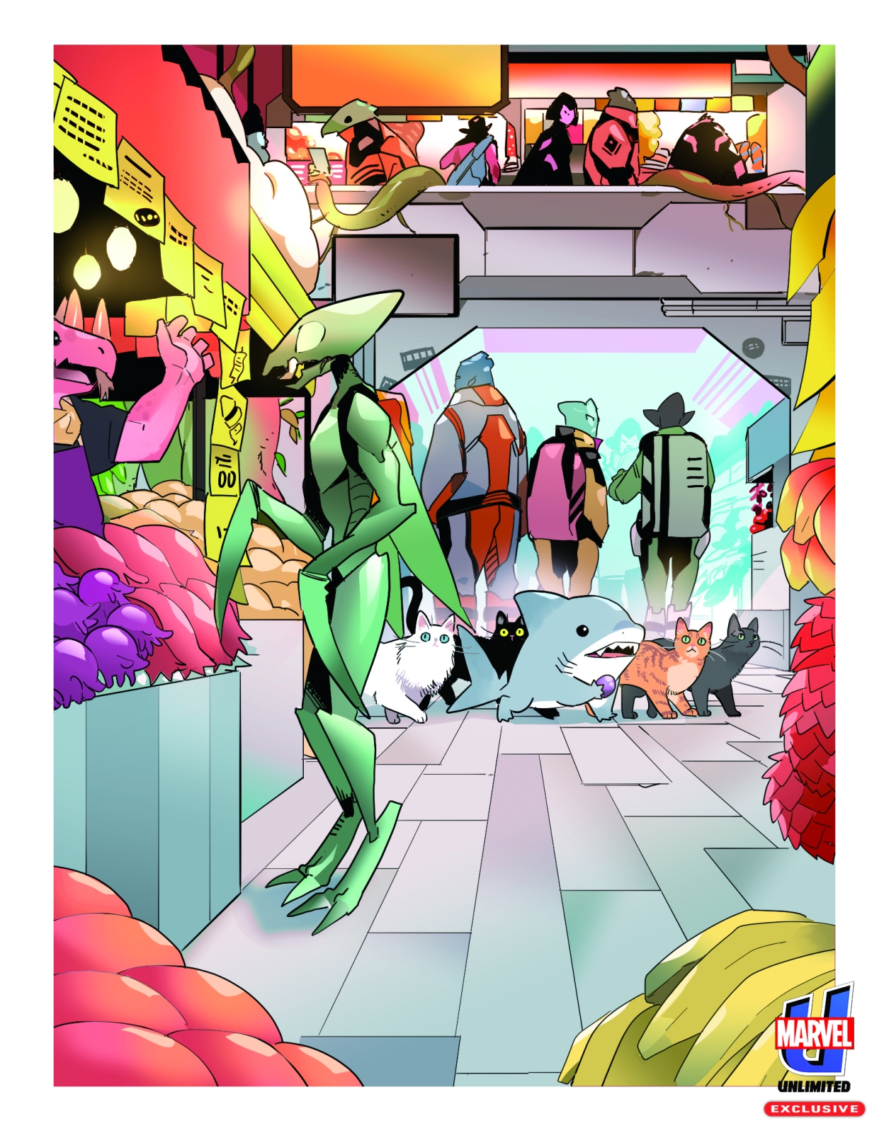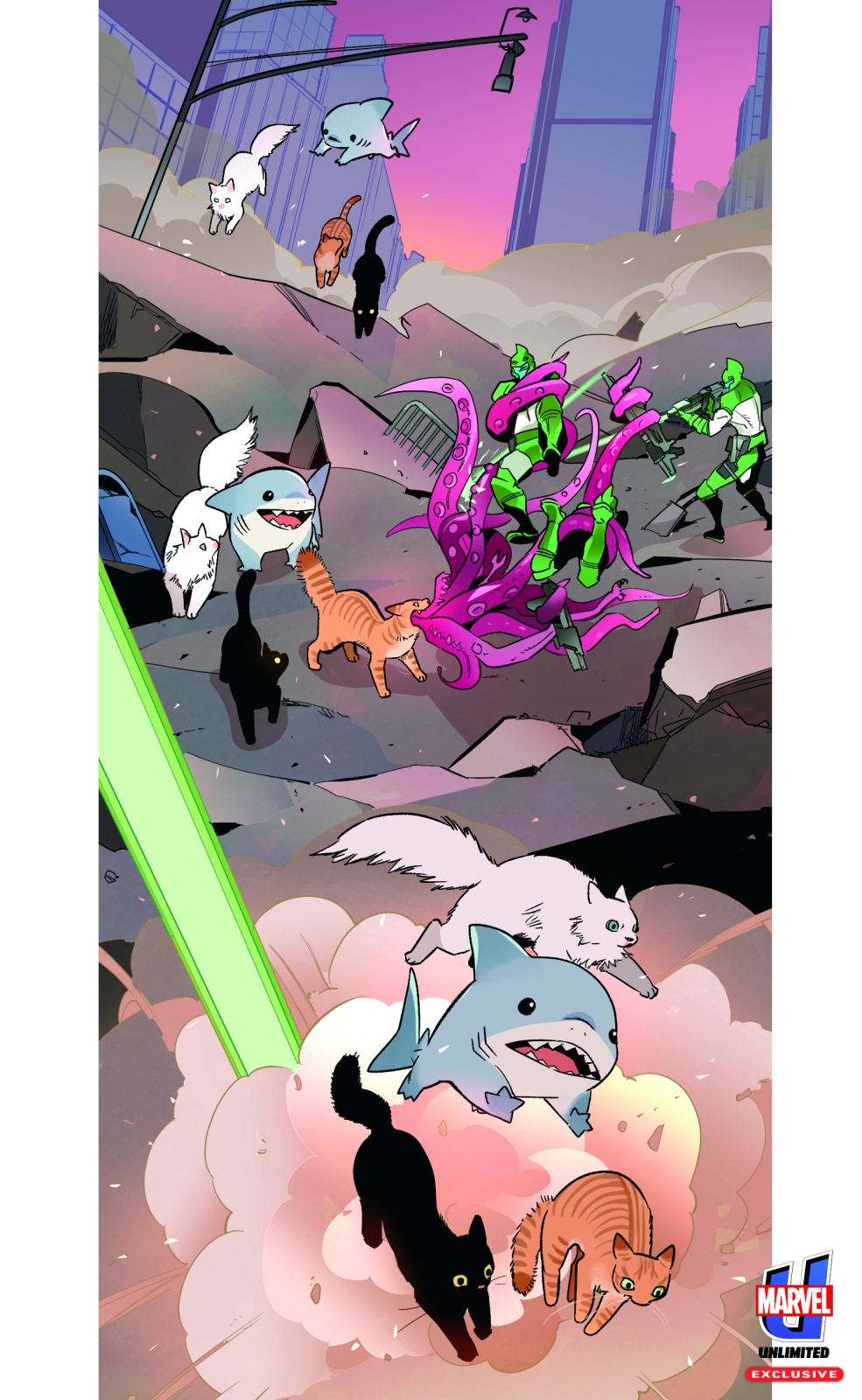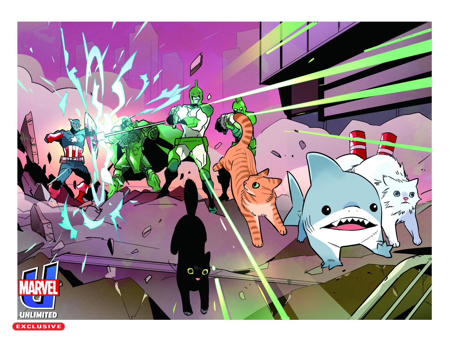 INFINITY PAWS features fan-favorite animals from across the Marvel Universe including Jeff the Land Shark, Carol Danvers’ feline companion Chewie, Alligator Loki, and Lucky the Pizza Dog. In the story, Ronan the Accuser lays siege to New York City and the Avengers with the aid of the Space Gem! But can one land shark and a couple of cats defeat him and save the day?