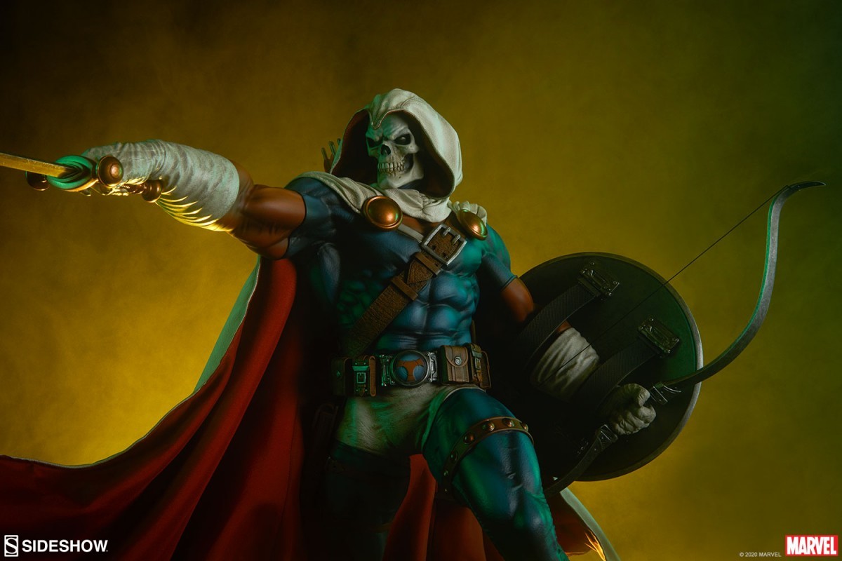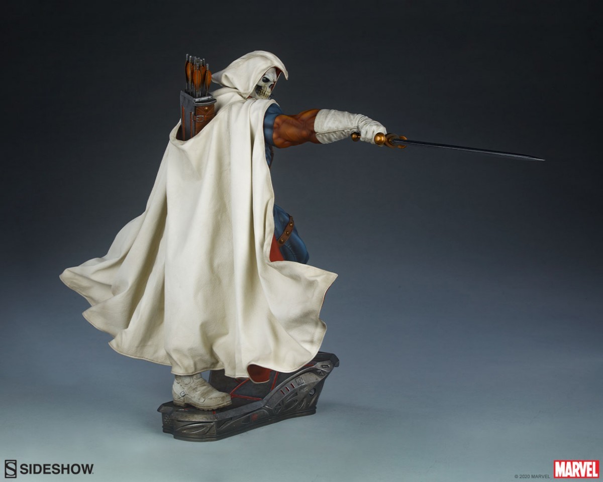 The polyresin Taskmaster Premium Format Figure features a mixed media costume with faithful callbacks to his earliest appearance as well as modernized elements. Taskmaster wears a wired, posable fabric cape and hood with a white textured exterior, red inner lining, and weathering details. The rest of his blue, orange, and white costume is sculpted and includes his bodysuit, belts, gloves, and boots to complete his striking look. Taskmaster’s shield and belt buckle are emblazoned with his signature ‘T’ shaped logo, and his menacing skull mask portrait gives this master combatant an ominous appearance.