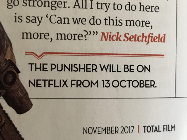 Despite the fact we’ve had an official poster and trailer in the past couple of weeks, Netflix continues to keep the release date for its next Marvel series The Punisher tightly under wraps. However, it seems Total Film may not have got the memo, as the latest edition of its magazine suggests that Frank Castle’s solo series will hit the streaming service on October 13th.