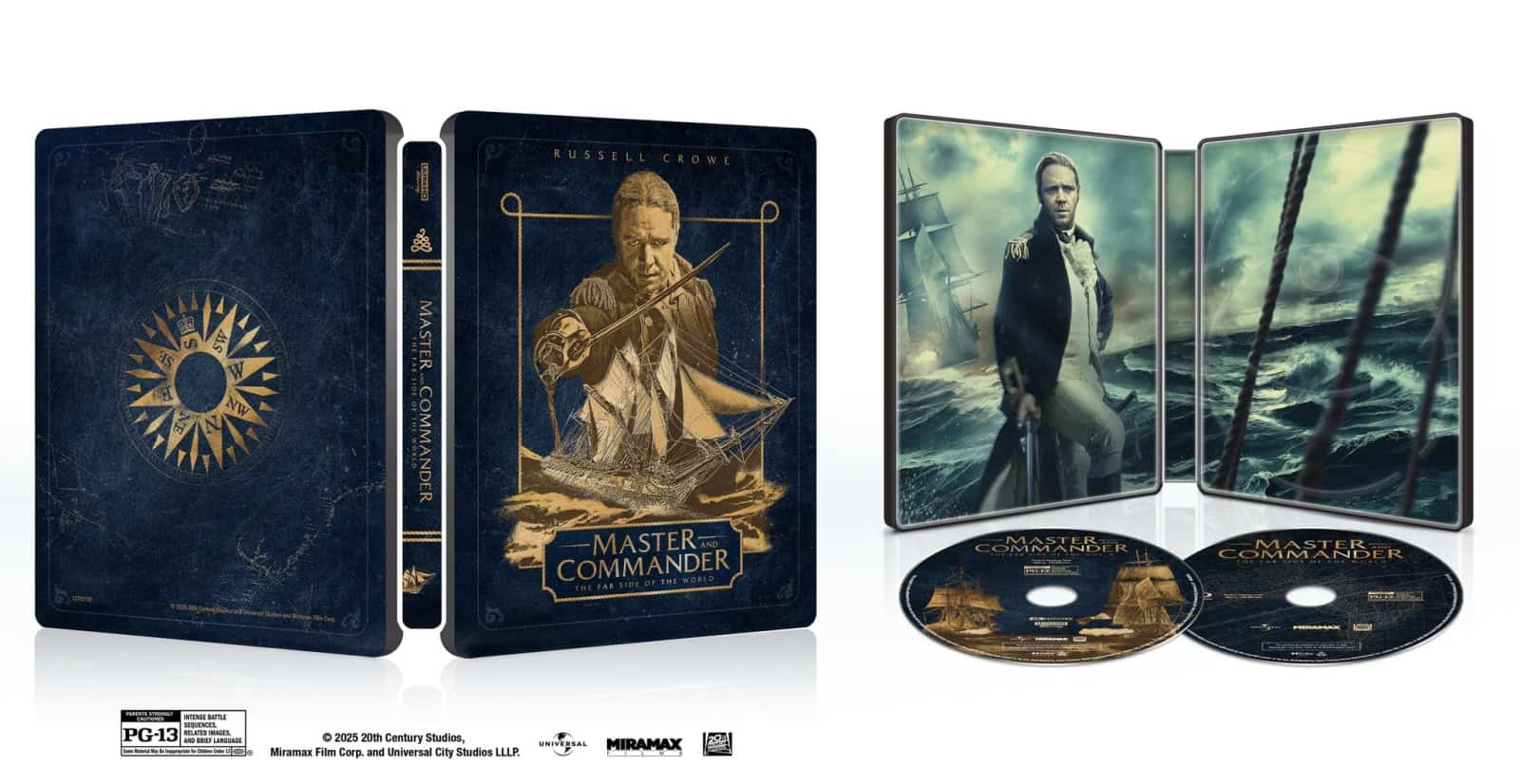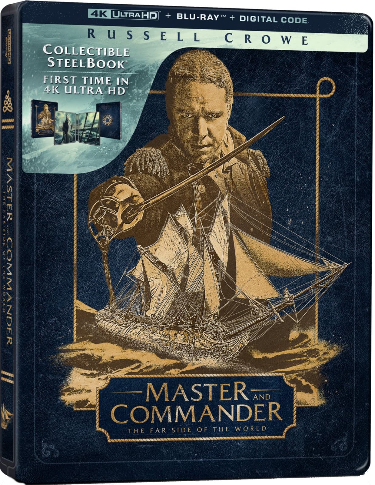 The Master and Commander: The Far Side of the World 4K Ultra HD Blu-ray release is housed in a collectible two-disc SteelBook® set, featuring striking, navy-and-gold nautical artwork that reflects the film’s epic scale and maritime themes. The exterior showcases a richly detailed compass rose and a bold illustration of Captain “Lucky Jack” Aubrey, while the interior reveals a sweeping ocean vista with Russell Crowe poised against stormy seas – offering fans the ultimate collector’s edition.