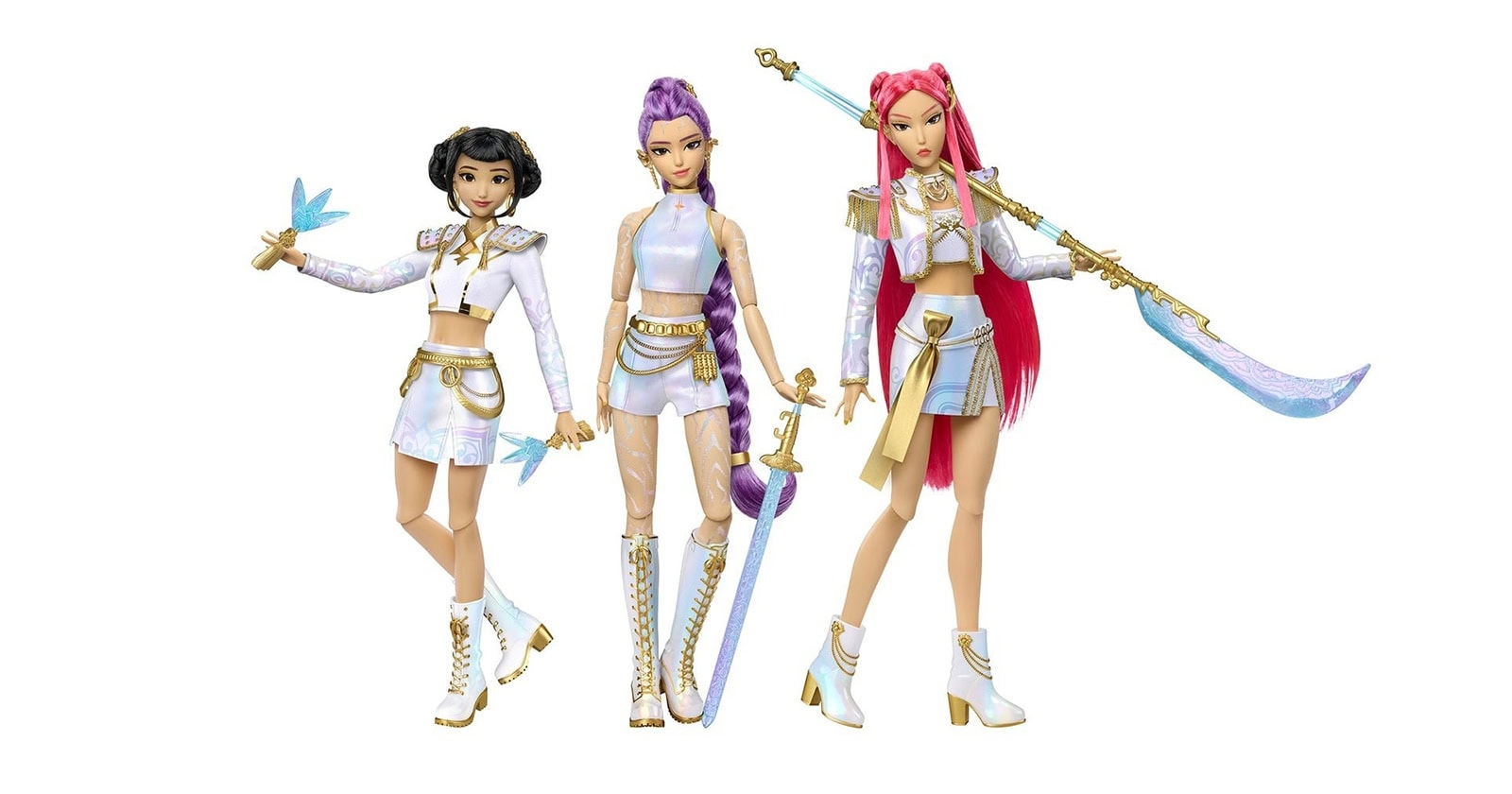 HUNTR/X brings their iconic style to Mattel in this 3-doll set. Looking sen-slay-tional in outfits from their final performance in KPop Demon Hunters, these HUNTR/X heroines are ready to give their fans the concert of a lifetime. Lead singer Rumi’s look shows off the patterns that mark her skin, with Mira and Zoey beside her in complementary styles.
