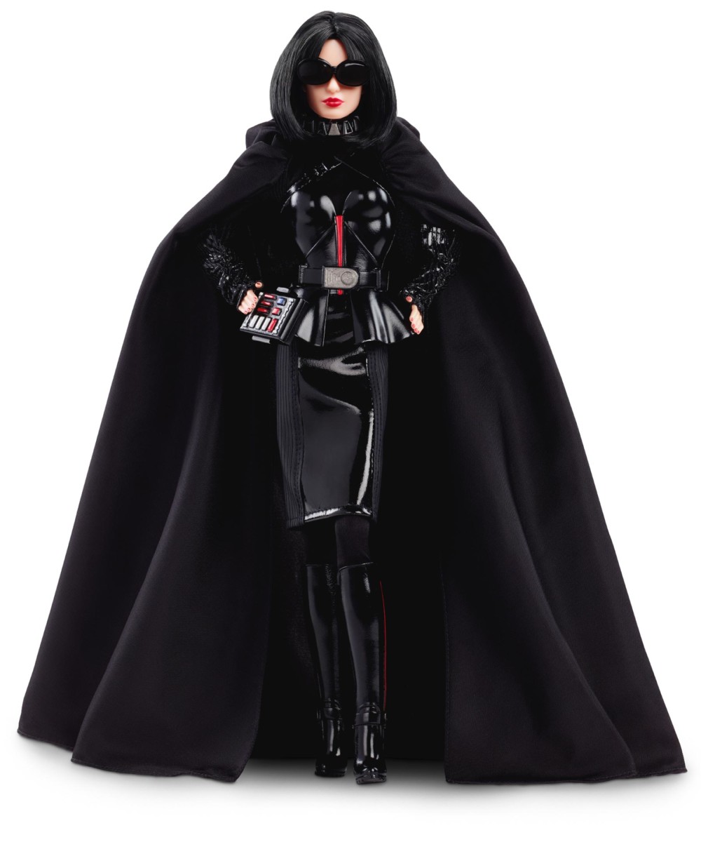 Once a heroic Jedi Knight, Darth Vader was seduced by the dark side of the Force, became a Sith Lord, and led the Empire’s eradication of the Jedi Order. This collectible Star Wars x Barbie doll captures Darth Vader’s Sith armor silhouette in a head-to-toe shiny-black ensemble. Metallic details at her collar and waist, dark glasses and an emblematic black cape finish the look.