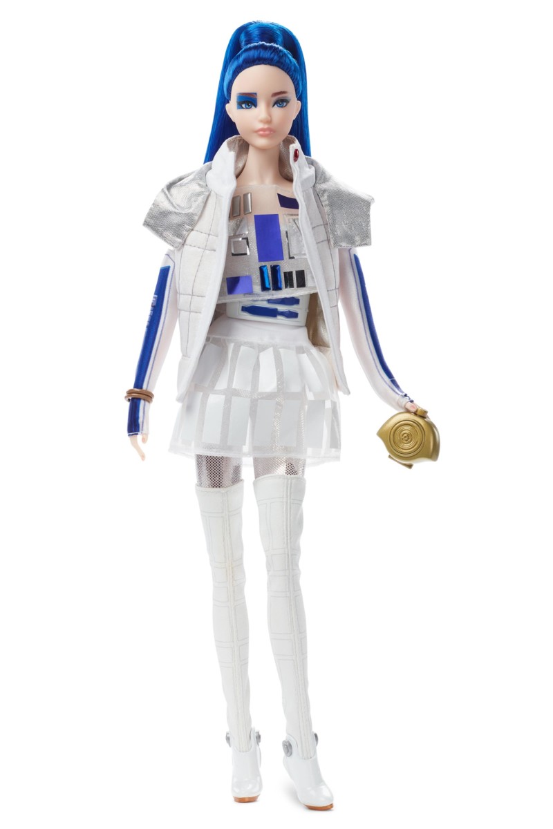 A resourceful astromech droid, skilled starship mechanic and fighter pilot’s assistant, R2-D2 showed great bravery in rescuing his masters and their friends from many perils. Star Wars R2-D2 x Barbie® doll captures the lovable droid’s look in a geometric ensemble with a dome skirt, bomber jacket and thigh-high boots over silvery tights. A vibrant blue ponytail and “radar eye” detail complete the look.