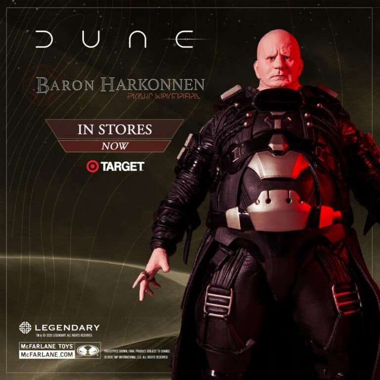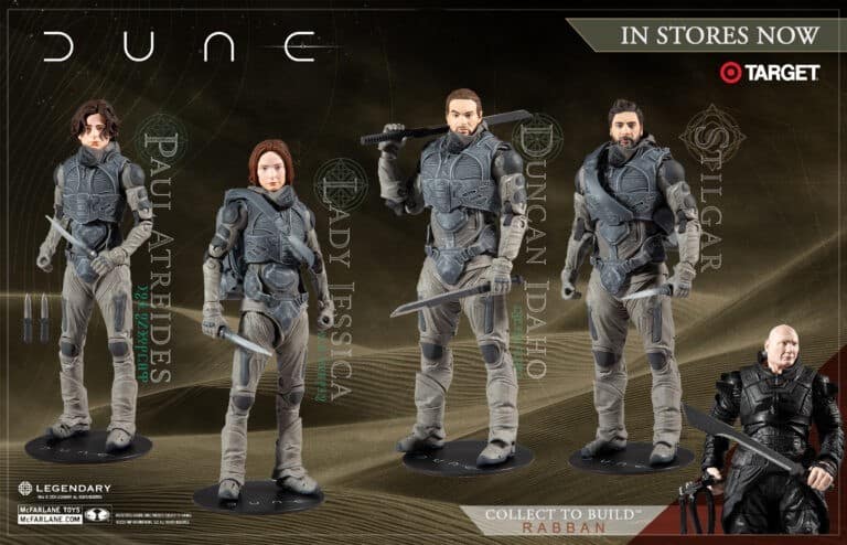 Denis Villeneuve’s Dune may have been pushed into 2021, but McFarlane Toys’ line of tie-in action figures are set to go on sale as planned this month, and you can check out some promotional images of the line here which includes 7-inch figures for Paul Atreides (Timothee Chalamet), Lady Jessica (Rebecca Ferguson), Duncan Idaho (Jason Momoa), and Stilgar (Oscar Isaac) – each of which come with a Rabban (Dave Bautista) Build-A-Figure piece – along with a 12-inch Baron Harkonnen (Stellan Skarsgard)…