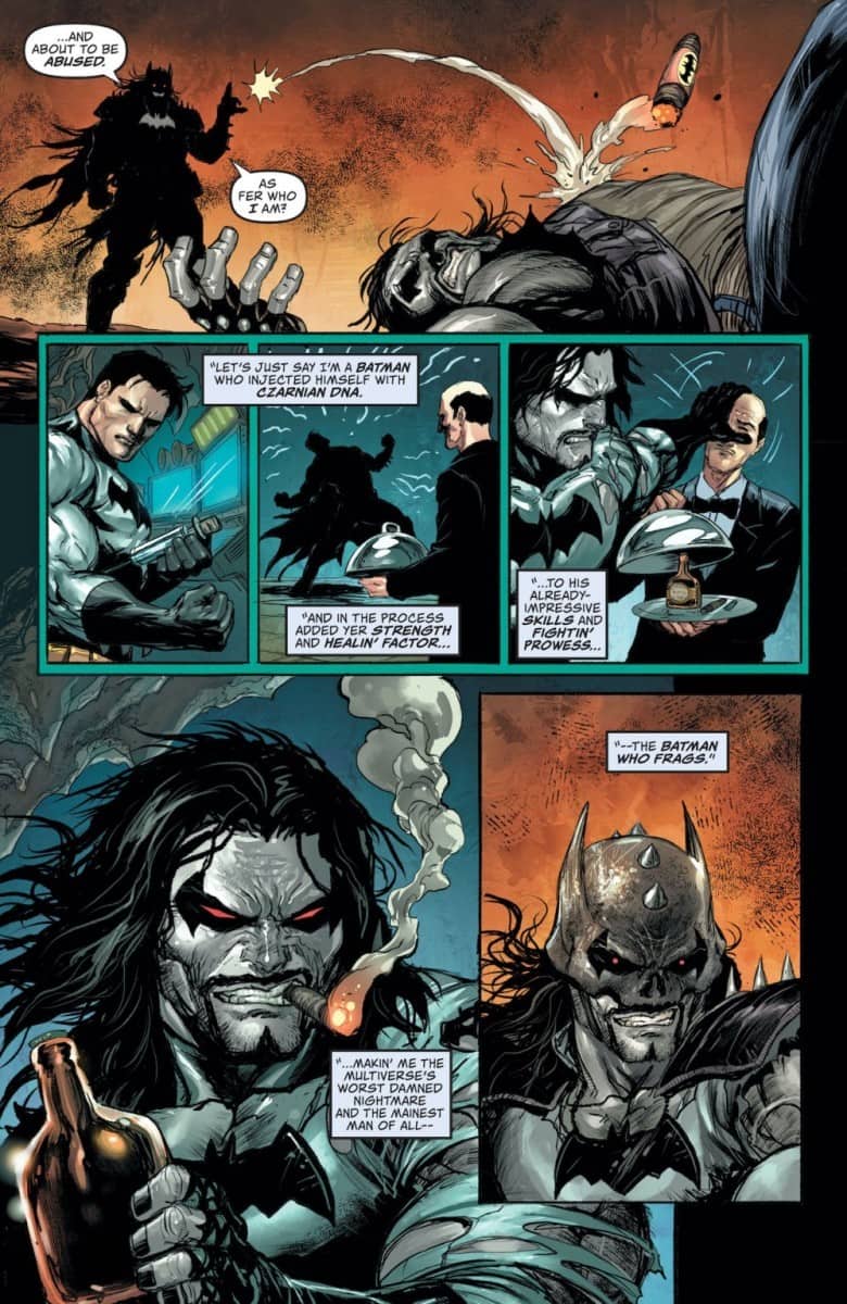 DC Comics has released a preview of this coming week’s Dark Nights: Death Metal Infinite Hour Exxxtreme!, which introduces the next Dark Multiverse Batman, the ‘Mainest Man of All’, the Batman Who Frags!
