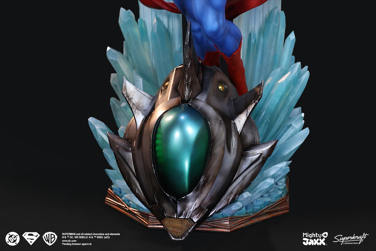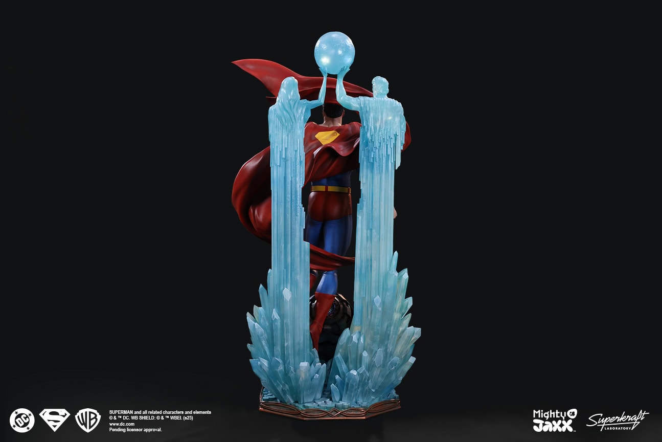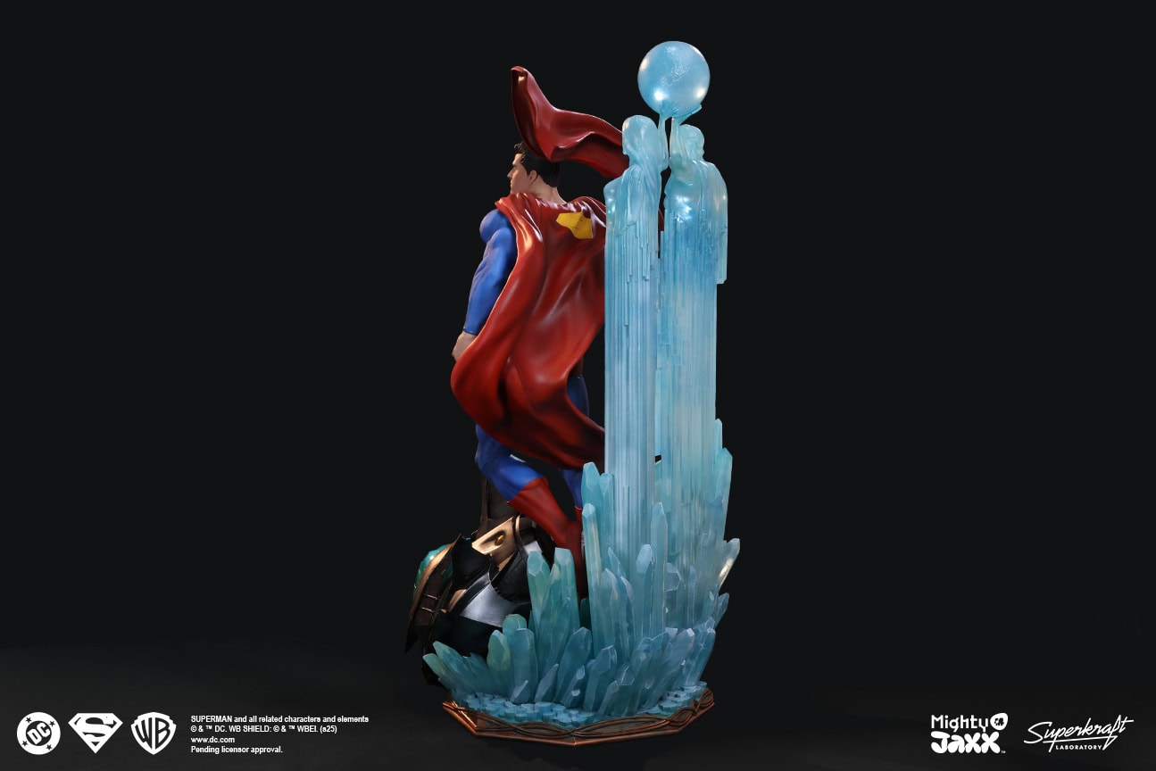 The base is inspired by the Fortress of Solitude and is sculpted in translucent resin to evoke Superman’s sanctuary. The result is a breathtaking piece that bridges Superman’s past, present, and eternal symbol of resilience.