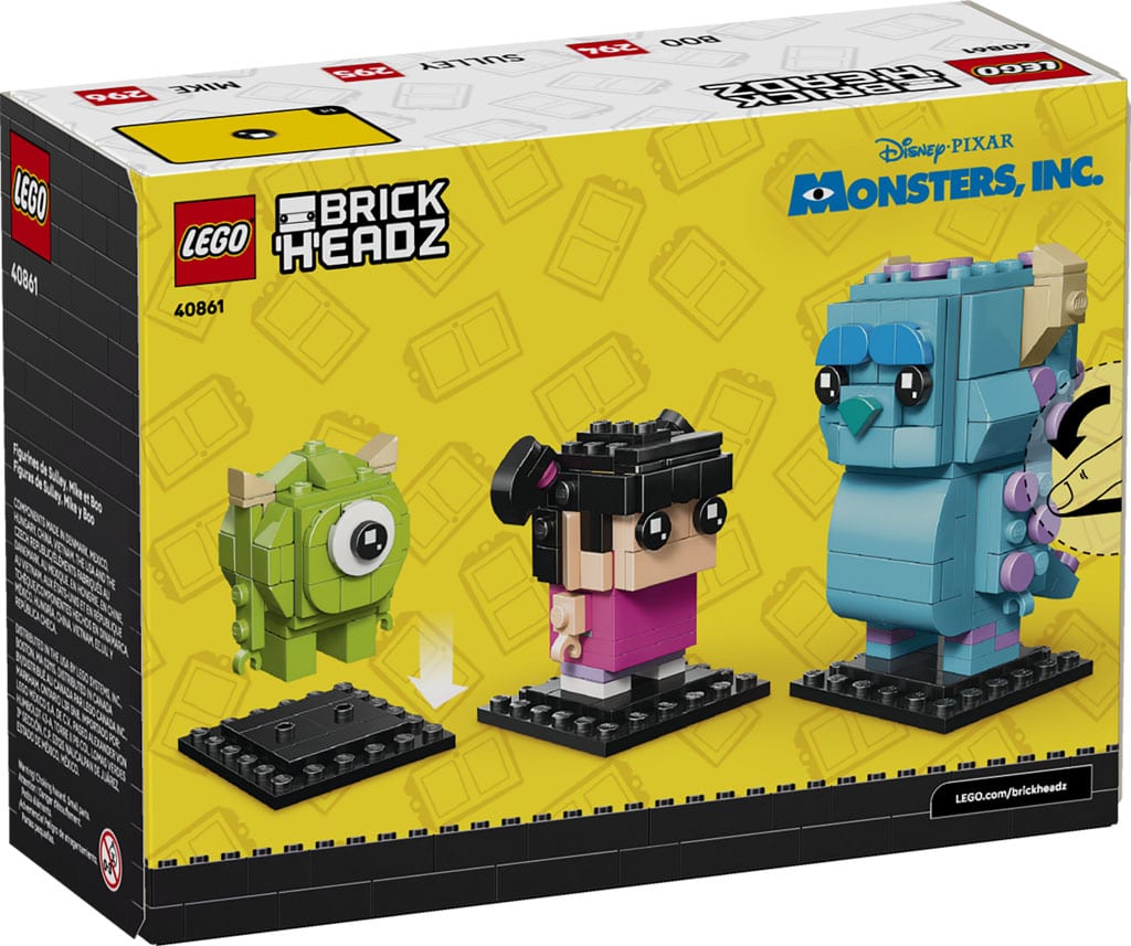 - FUN AT FIRST SIGHT – The buildable versions of the characters from Disney and Pixar’s Monsters, Inc. movie have well-known details including Sulley’s horns, Mike’s center eye and Boo’s pigtails