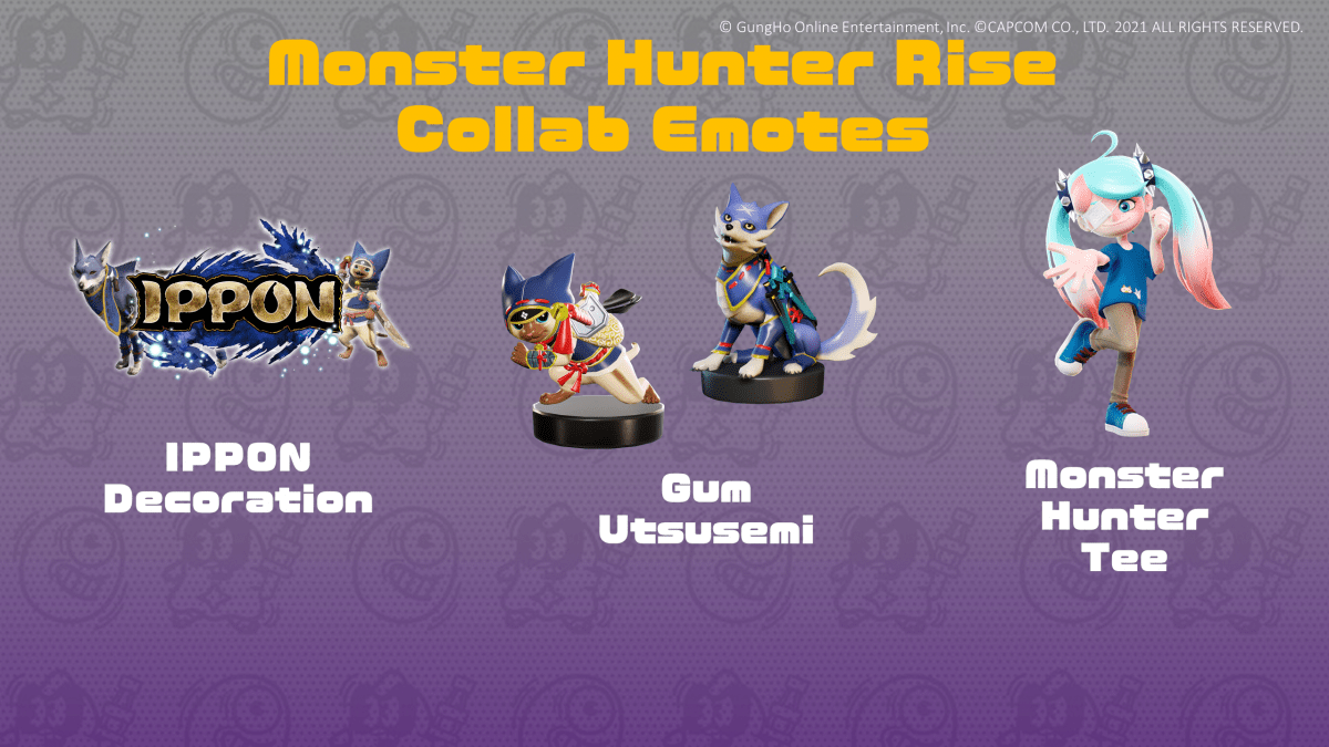 During the Monster Hunter Rise collaboration event, all players can gain a MHRise Palico Sticker simply by logging in. It’s also possible to earn a MHRise 1 IPPON Decoration as a battle reward for just taking part. Other items available to players during the event are a MHRise 2 IPPON decoration featuring a Palamute and a Palico and a Monster Hunter Tee.