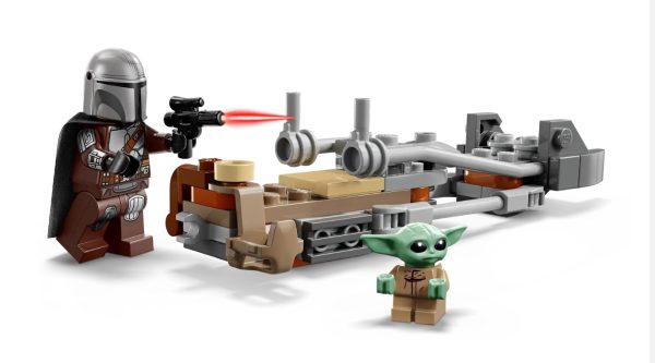 - SPEEDER BIKE – Attach The Mandalorian’sblaster rifle to the back of the speeder bike, and place him in the driver’s seat with Grogu alongside in the attached satchel