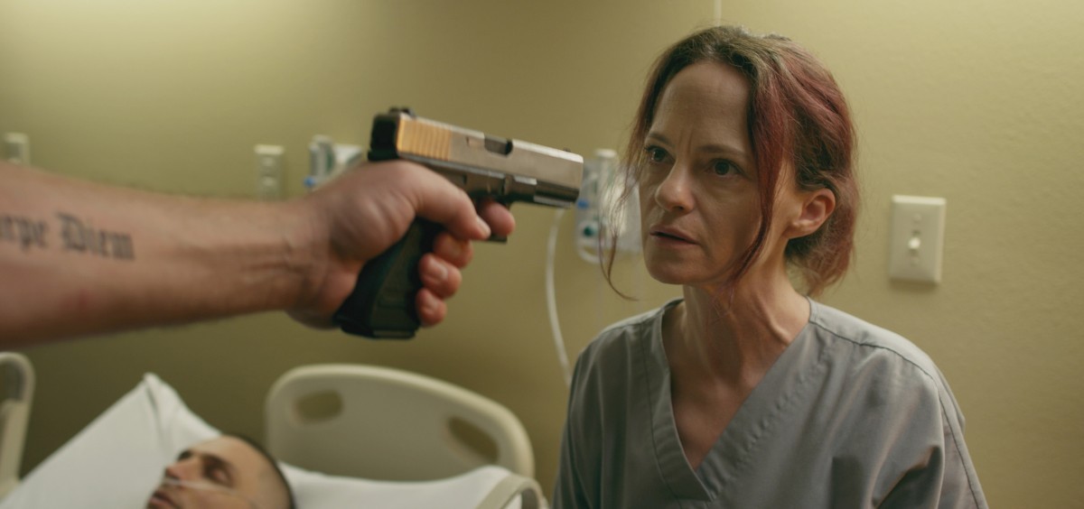 Digressing, the story centers on a late-night hospital shift involving colorful characters such as Mandy (Angela Bettis), estranged from her family, and in the business of selling off organs she sneakily retrieves from deceased patients. She does keep in touch with her cousin Regina (Chloe Farnworth), currently in the process of obtaining a kidney for her as requested in a trade by a ruthless gang of criminals led by former professional wrestler and a hardcore legend Mick Foley. Initially, it appears as an odd choice for some villainous casting, but he essentially cuts a promo as if he’s inside the squared circle letting the viewers know that these people mean business and that Regina better return with the organ before sunrise.