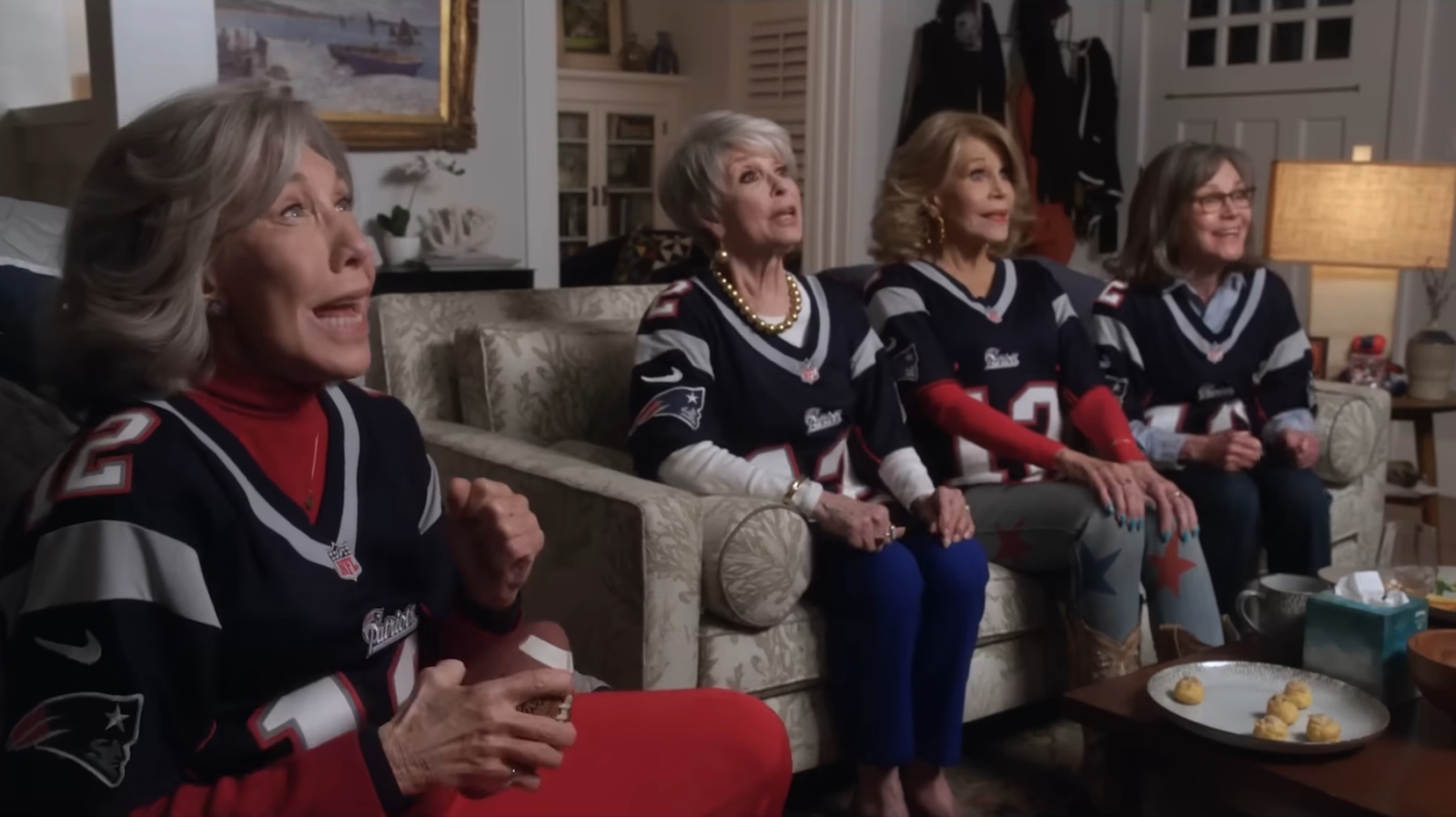 There’s a basic trait to each of them; supporting Lou (Lily Tomlin) through chemotherapy brought them together and inadvertently turned them into football fans during Tom Brady’s rookie season. As such, she takes their dynamic the most serious of the bunch. Trish (Jane Fonda) is the flirt who writes erotica about Tight End Rob Gronkowski, whereas Sally Field’s mathematics expert Betty becomes most interested in statistics. Meanwhile, Rita Moreno’s Maura is in the process of moving on from her deceased husband.
