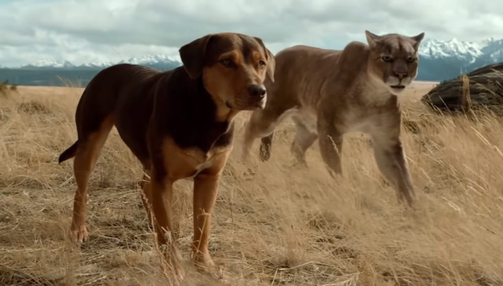 While finding her way home, Bella also befriends a baby cougar that she assists in finding food (among other things) following a pack of hunters murdering her mother (it’s nice that the film condemns hunting, but it’s also done so in the most in-your-face way that it ends up meaning nothing). Said baby cougar is completely rendered in CGI and a quite ghastly creation, looking somehow more distracting than the nonstop visual glitches that kept occurring (this wasn’t the film’s fault, the projection simply wasn’t working right). Another dog also comes into the picture, and I shit you not, at one point in this movie a small dog causes a catastrophic avalanche that injures a human and creates a perilous life or death chase sequence. The tagline for A Dog’s Way Home states that “a lot can happen between lost and found”, operating as a threat leaving audiences wondering what contrived event could possibly occur next before the obvious, overly sentimental ending (made even more cloying with terrible feel-good songs that persist throughout the entire movie).