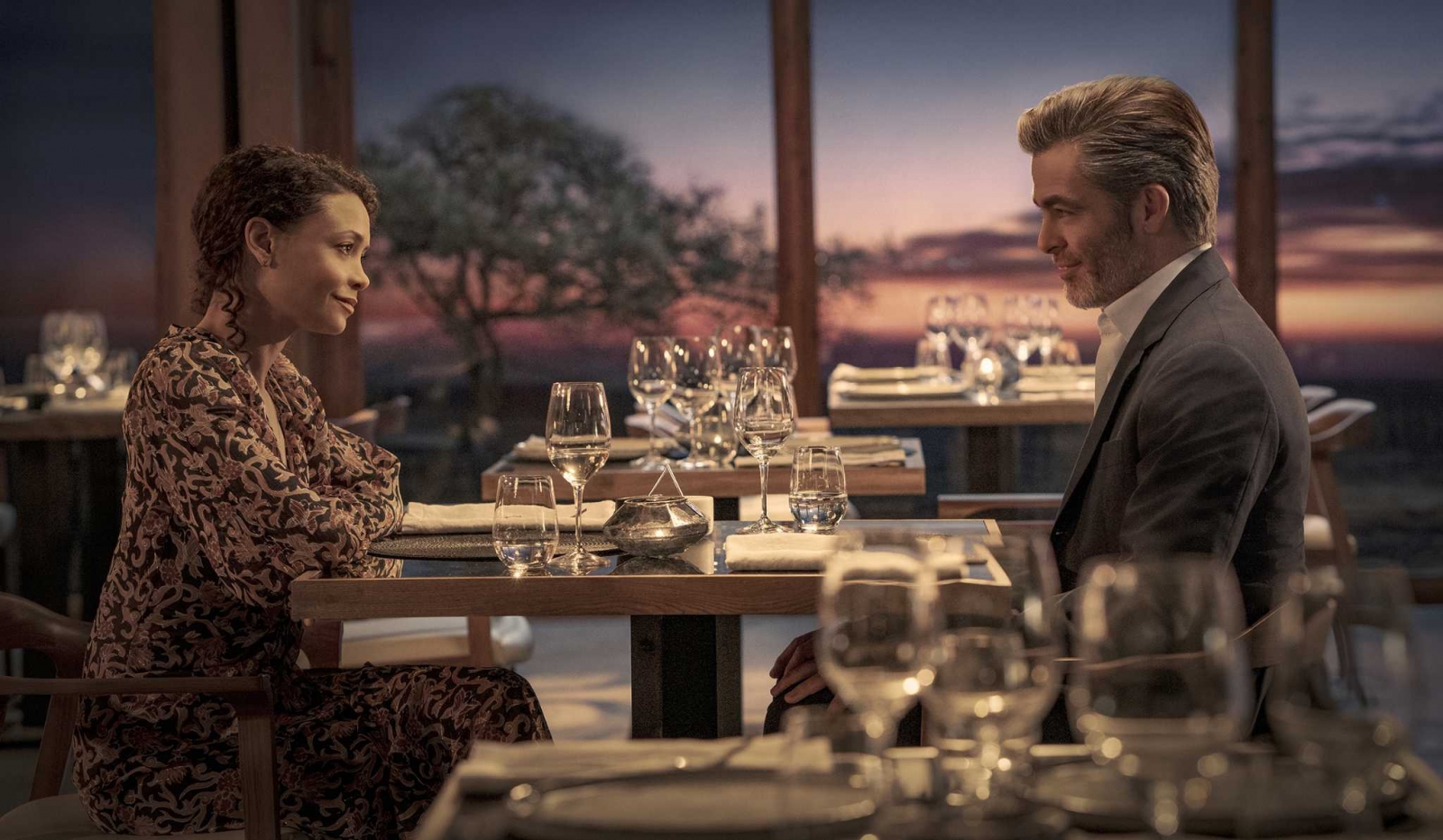 Seven or so years later, Henry Pelham (a dreamy Chris Pine, blue eyes highlighted as he switches back and forth between probing for answers and reflecting on his love life) meets his previous flame Celia Harrison (Thandiwe Newton, the MVP here, whether it’s dealing with her baggage from the unfortunate taking of Royal Jordanian Flight 127 and not being able to save any of the 100+ lives on board or engaging in steamy eroticism with her equally game costar that is surprisingly more intimate and explicit than anything found in the recently released Deep Water) at a seaside restaurant to discuss that day one more time.
