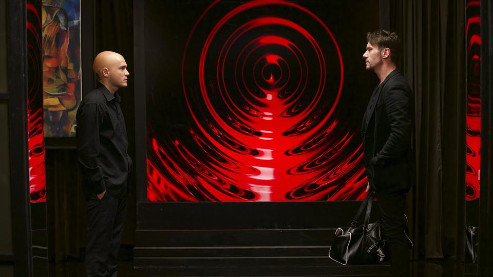 From there, American Night settles back into chronology, diving into the backstory of artist John Kaplan (Jonathan Rhys Meyers), struggling to keep his gallery afloat alongside his art curator girlfriend Sarah (Paz Vega). There are also flashbacks within flashbacks, showing their start in the community, including some sex involving painted bodies. It’s another element that I’m not sure whether to laugh at or at least applaud the filmmakers for having some creativity and commitment to the art world backdrop. Nevertheless, this section does drag on (Michael Madsen makes an appearance for some threats), explaining that John is in a tough spot financially and creatively. Its purpose is also plain and could have been accomplished without dedicating an entire second act to it (and without detours to nightclubs so a musician that sings the theme song of the movie can have her own pointless scene).