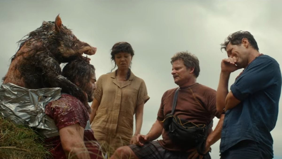 The first concerning sign that the filmmakers might not be able to pull this off is how quickly a montage kicks in once the friend group connects with an eccentric snake wrangler (Selton Mello) and boating guide (Daniela Melchior, revealed in the prologue to be playing a character here with other motives). It’s not that there aren’t many jokes watching this DIY crew go to work, but that some of them flail, eliciting no reaction (an extended conversation about how to do a headbutt properly falls flat). Griff and Claire, who had once dated, begin to rekindle that flame while filming their scenes (he gets to play a hero), but it’s neither romantic nor funny. Perhaps even worse, I’m not sure even the filmmakers know what it’s supposed to be.