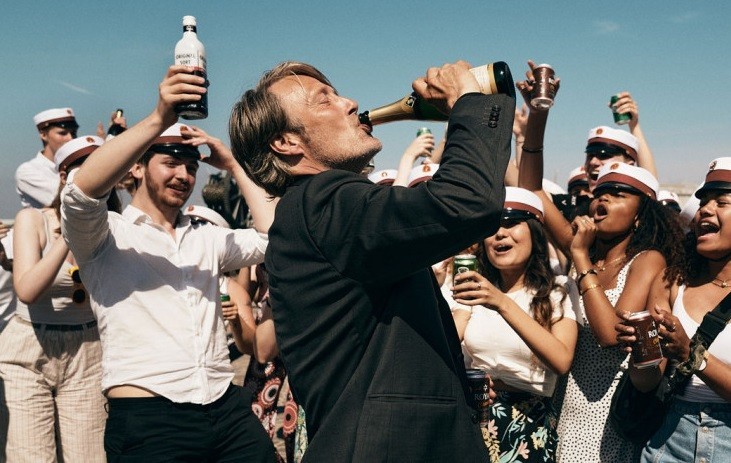 The reasoning behind this teaching exercise (aside from the fact that students are more likely to learn and retain information if education is made more relatable and interesting) falls in line with the social experiment at the center of Another Round (the latest from Thomas Vinterberg that sees him once again collaborating with The Hunt filmmaker – not to be confused with the American film released earlier this year of an entirely different genre – Mads Mikkelsen) taken from a theory that hypothesizes human beings are born with 0.5% less blood-alcohol than required to fully function throughout the day. The solution to this is to have the amount of alcohol in the body starting in the morning until the evening.