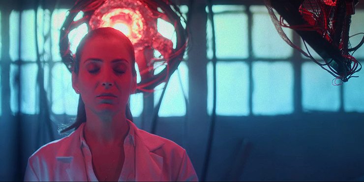 Well for starters, writer/director Keir Burrows ensures that philosophical questions are asked of the audience. Then he goes further by crafting an intelligent, involving and flowing screenplay as a backdrop for tight direction and some great cinematography (courtesy of Gerry Vasbenter). Three scientists, Ana, Nate and Liv work on creating a matter transporter. They push boundaries in their lab until they think they have it cracked. From marbles, to caterpillars, to cats, every experiment works, but in order to seek the funding to push things into potentially world changing developments, they need to successfully navigate a human test. Ana (Yaiza Figueroa) takes the challenge. Seemingly it goes off successfully. She is transported instantly but something doesn’t feel right. She struggles to remember things and loses track of time. Her notes are stolen. Seemingly targeted and struggling to make sense of things she slowly loses a grip on sanity and questions the motives of her colleagues.
