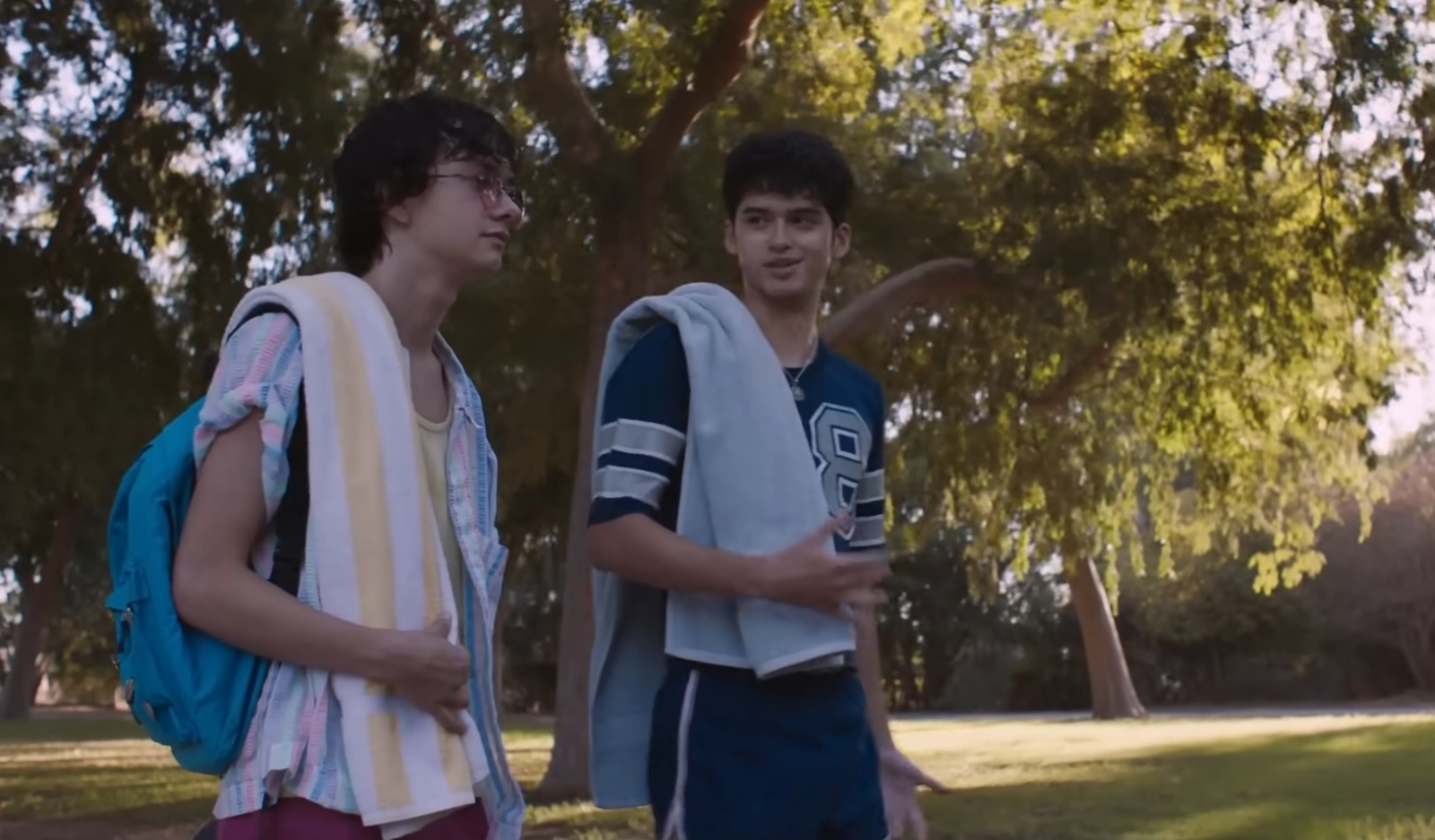 Aristotle Mendoza (Max Pelayo) is an introverted lone-wolf teenage boy who prefers to bottle up his emotions. His brother went to jail for murder years ago, which has conditioned him to avoid becoming a toxic male for fear of repeating some of those same mistakes. He also has no interest in girls, as he perceives most of the boys around him as gross womanizers, which may be accurate, but it also becomes clear that he is gay and in denial about his sexuality. This especially becomes obvious once he meets the wealthy, confident Dante Quintana (Reese Gonzales), who is also cheerful, humorous, and very interested in Aristotle, teaching him how to swim on a summer day at a public swimming pool.