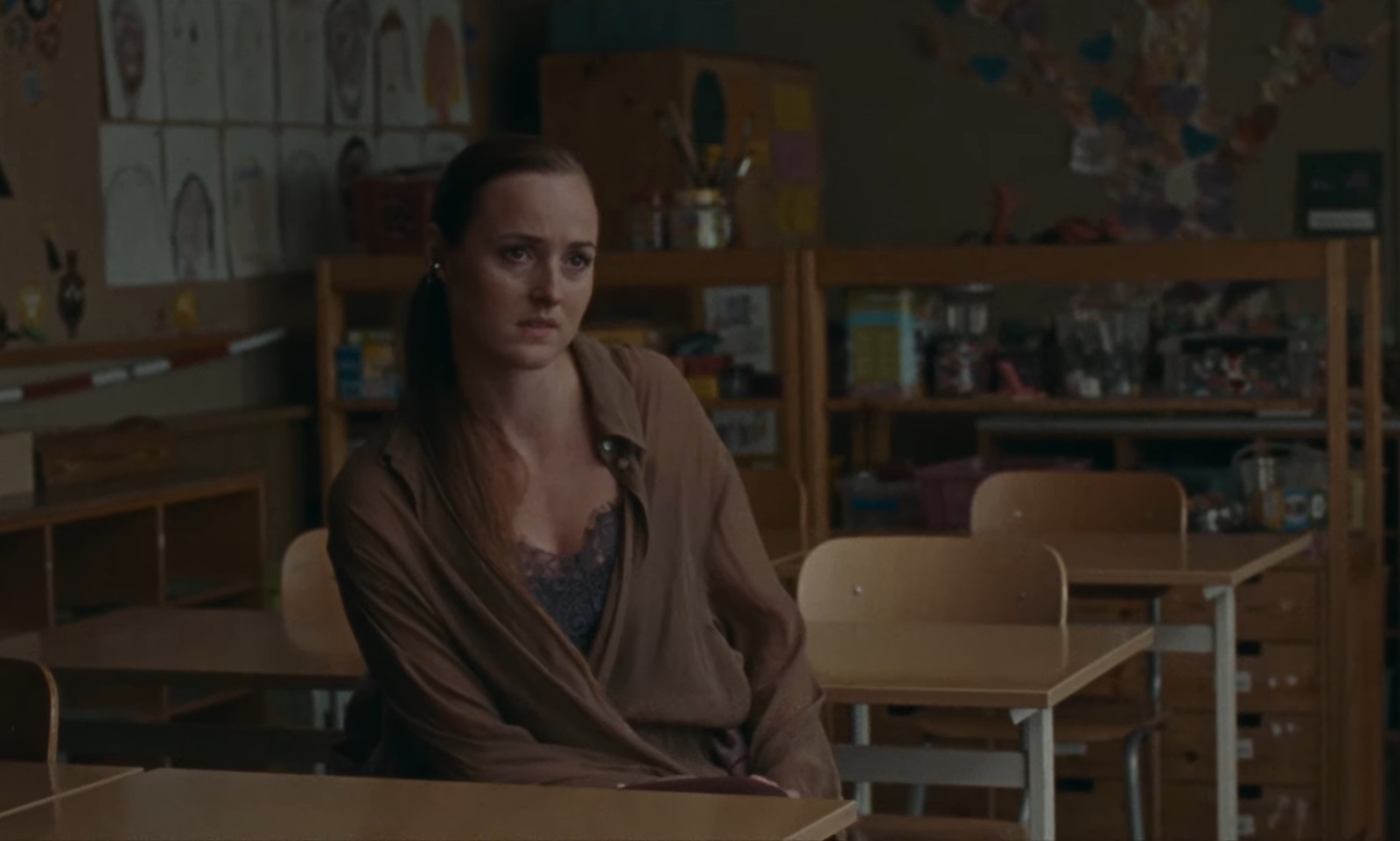 Elisabeth (Norwegian shooting star Renate Reinsve, a supremely talented young performer who consistently finds herself in grim stories, sometimes playing morally compromised characters, all to the point where one hopes someone put her in a comedy or animated feature next) is a widowed, struggling actor (it is implied that her career might be over), presenting herself as a bit of a diva craving drama. That’s precisely what she is getting, as school counselors and principals (played by a combination of Øystein Røger, Thea Lambrechts Vaulen, and Vera Veljovic-Jovanovic) have summoned her for a private conversation with them and parents to another boy, Thomas, played by Ellen Dorrit Petersen and Endre Hellestveit. However, there is probably no way to prepare any parent for what Elisabeth hears, which is that her child, Armand, is accused of sexually violating another boy in the school bathroom following an apparent playground argument.
