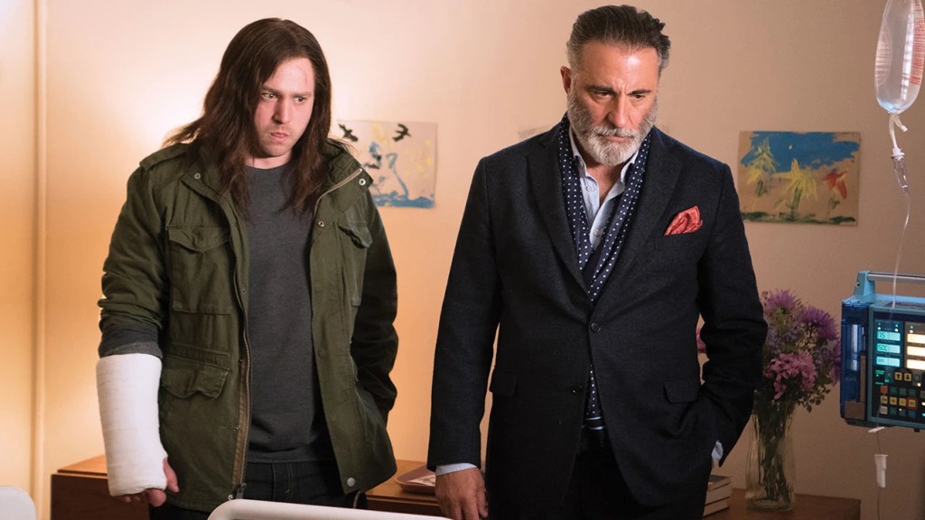 Emory Cohen is Samuel, a successful writer in the present day participating in a promotional book tour for his biography on successful businessman Floyd (a performance from Andy Garcia that could have benefited from breaking into unhinged Al Pacino territory like he consistently teases doing). As Samuel reads passages from the book, Big Gold Brick flashes back to that stage in both of these people’s lives, as their story is intertwined.