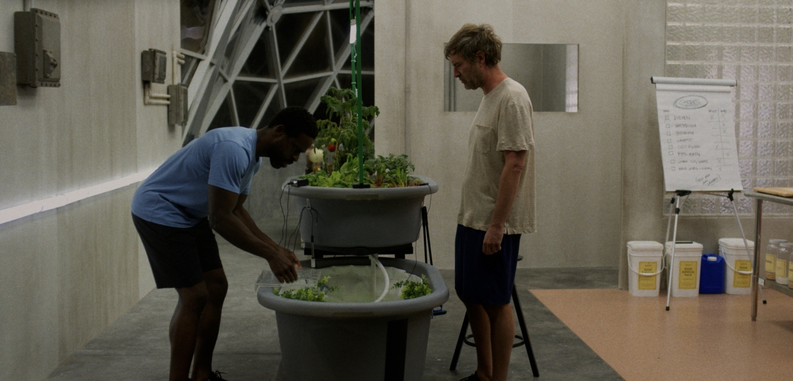 Following an ambiguous disaster that has left the pitch-black outside world uninhabitable, former US President and dimwit Billy (a disheveled and unkempt Mark Duplass, representing the hopelessness of the character) and his right-hand man scientist Ray (Sterling K. Brown, playing up curiosity and discovery amongst unexplainable events) have hunkered down inside the titular biosphere that the latter built in case of such apocalyptic emergencies. For food, they eat fish taken from a small pool while ensuring that there are enough females for breeding, thus more to consume.