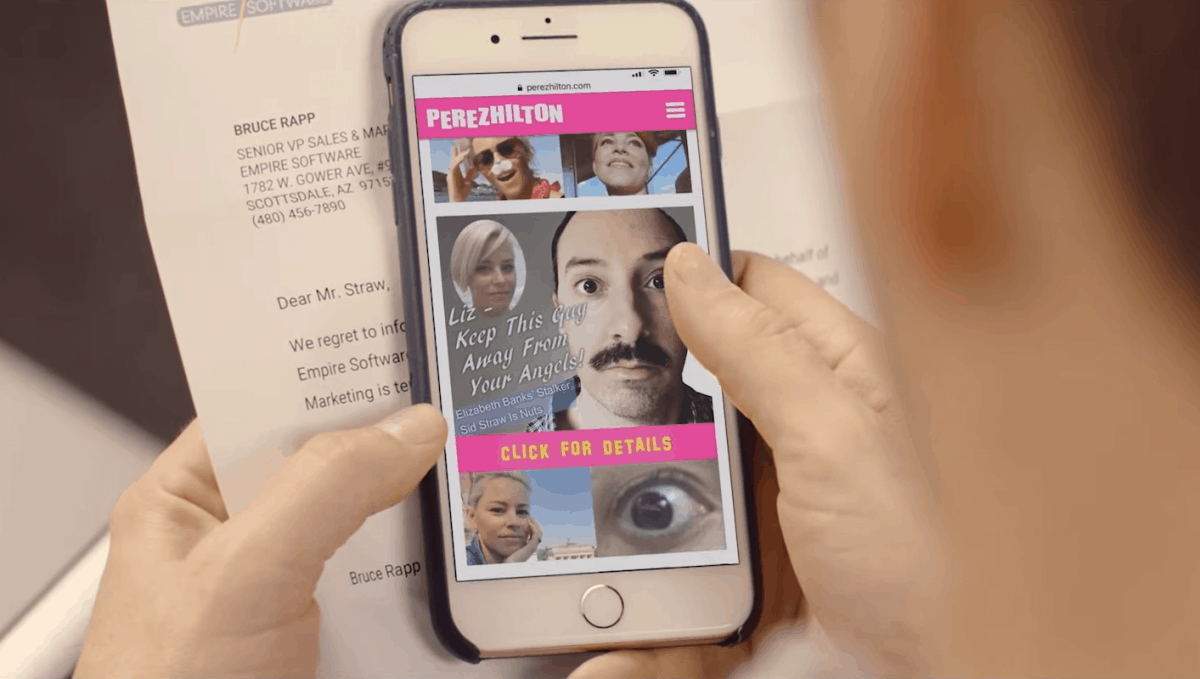 In this interpretation, Sid Straw is played by Tony Hale who does his damnedest to ground the maladjusted social behavior into something harmless stemming from loneliness and wasted potential rather than outright creepy. The celebrity he claims to have known is actress Elizabeth Banks, whom he tries to invite to a college reunion that he is ecstatic to be planning. This is attempted by creating a Facebook account (which is necessary towards putting together the reunion) and looking up her blue-checkmark Facebook page, proceeding to comment on pretty much any status hoping that she remembers him from their university days and that she is willing to show up.