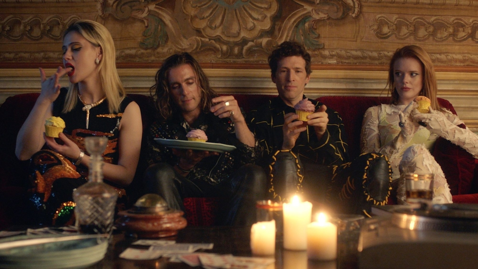Using fake names with a rehearsed, fictional backstory of how they got together, Dylan clearly has more personal reasons for wanting to steal this painting. Meanwhile, Milo is desperate for publicity and is currently a trainwreck, in a shady type of open relationship, constantly hiding secrets, and seemingly unhappy despite his wealth and relationship with Francesca. He gives off Russell Brand vibes, albeit not as problematic; even if there are some skeletons in his closet, he has remorse over them. An in medias res opening also doesn’t hide that none of this will end well, showing one character from afar cleaning up a deadly mess while obfuscating who we are looking at.