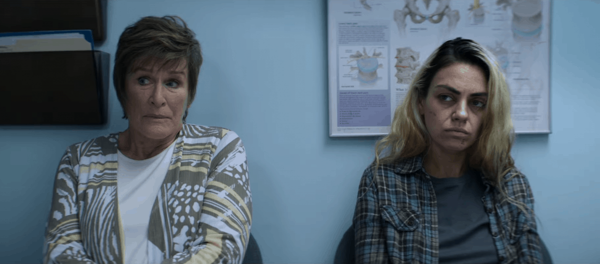 Played by a disheveled and strung-out looking Mila Kunis in Four Good Days (masking inflamed gums with fake teeth), heroin addict Molly is earnest in her efforts to overcome over a decade of drug addiction sprung on by an Oxy prescription following a waterskiing injury at age 17. After a detox stint, her former partner Sean (Joshua Leonard), who has his own battles with painkillers, stops by with their children for support. During that visitation, Molly plays video games with her children and loses, prompting the kid to repeat over and over, “you suck,” jokingly. To us, it’s a young boy goofing around with his mom, but as he keeps repeating the phrase, it becomes a reminder of her mistakes and the shame she outwardly bears. Looking on in the background is her mother Deb (Glenn Close, handling the boisterous melodrama with a balance of optimism and cynicism regarding her daughter’s chances of recovering for good), wearing the facial expressions of fear that Molly may lose it and verbally snap at her own child due to the trash talk hitting too close to home.
