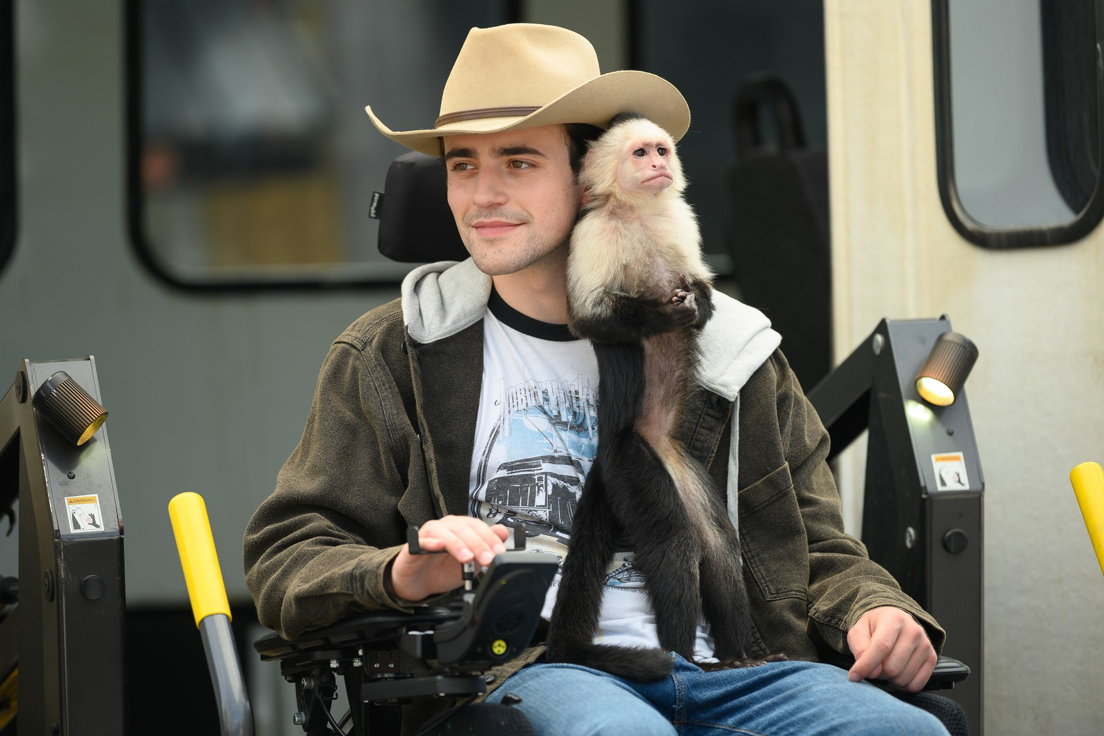 One of the only worthwhile scenes here is also the initial meeting between disabled man and helpful creature taking place in a shelter where service animals undergo training, with Elliott Davis’ cinematography following the monkey’s eyes as Nate circles around the room in his power wheelchair (and I will give the filmmakers props for getting those details right and using an actual high-grade wheelchair), softly introducing himself and getting acquainted.