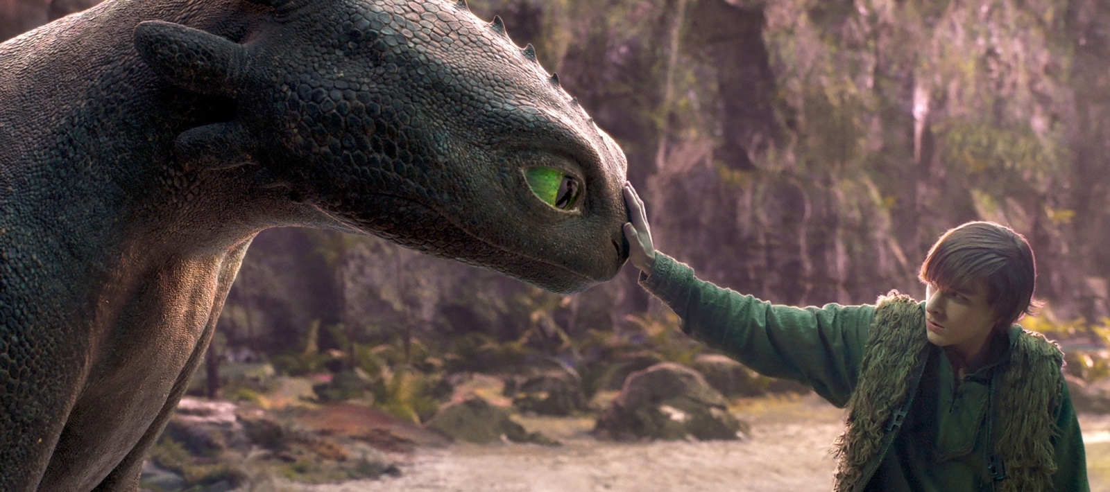 Following an attack on their village, Hiccup heads off into the forest (beautiful and serene with shots of mountains, creeks, and more) the next day to locate a dangerous dragon nicknamed Night Fury that he believes one of his heavy artillery contraptions injured from a distance. There, he finds the wounded dragon and is unable to finish it off, but instead uses his smarts not only to heal and get it flying again, but also to build devices to mount and ride while also serving as a copilot safely.