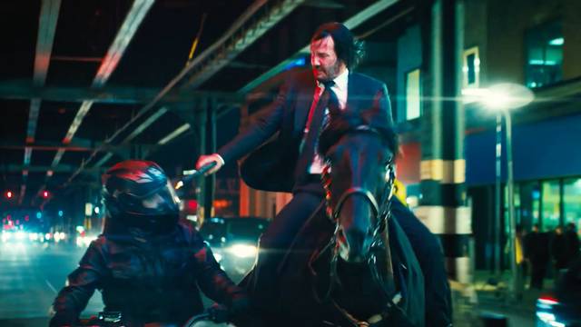 With the walls closing in on Mr. Wick (and by walls, I mean pretty much anyone that knows how to pick up a weapon and is aware of the centrical international assassins guild), the now excommunicado Baba Yaga tensely (place extra emphasis on that word, as these movies conjure up more suspense in their first five minutes than most movies can over an entire narrative, which is all the more impressive here considering the overpowered, godlike combat abilities of the titular assassin that essentially tell us he’s never really in danger until possibly the climax) heads to the library. An unorthodox place to go when there’s a $14 million price tag as a reward for your death, but A: John has a few favors/tokens stored away for a rainy day such as this one and B: breaks a guy’s neck by throat-punching him with a book. This is roughly 3 minutes into the movie. It is also quickly followed by a battle inside of an armory/museum that leads to a barn where horses assist John Wick in disposing of no-name assassins way in over their head, try as they might for all of that life-changing green. Logically, the final payoff to this explosive opening (as if there weren’t already enough brutal payoffs) is a horseback chase through the streets of New York City.