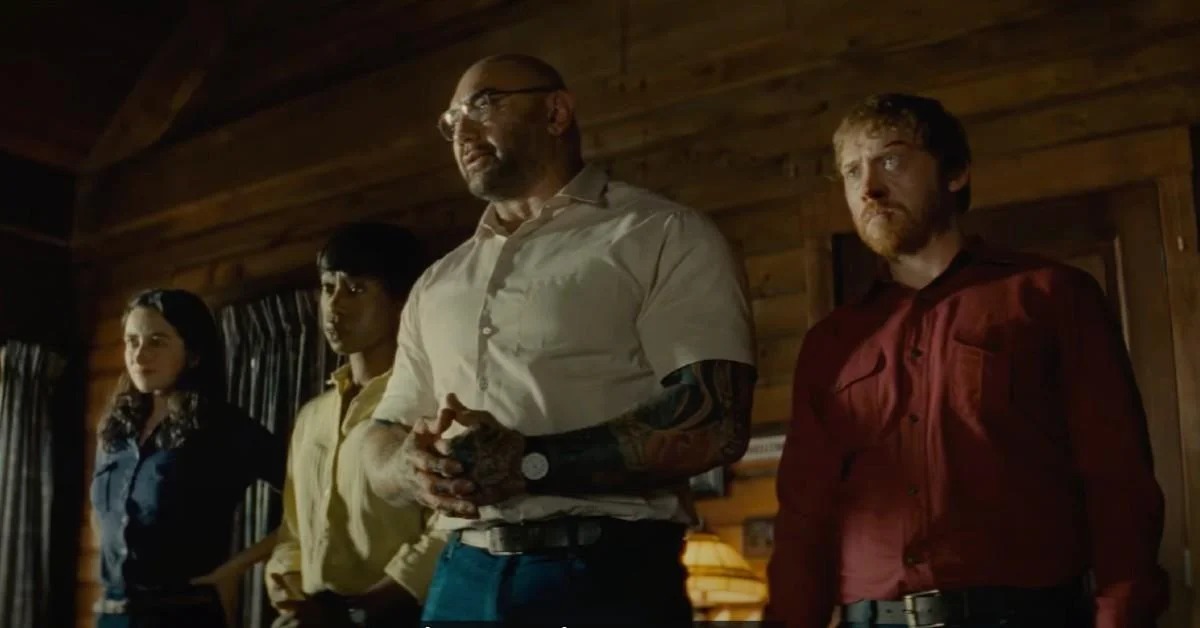 While vacationing at an isolated remote cabin in the woods, married couple Eric and Andrew (Jonathan Groff and Ben Aldridge), alongside their young daughter Wen (Kristen Cui), are visited by a group of strangers and taken hostage to plead and persuade that the apocalypse is among us and that only they can prevent it by sacrificing a member of their family. Suicide is a no-go; one has to kill another, and perhaps they were chosen because the family, despite having no blood relation to their child and having a marriage that a good portion of society is fervently against the backward views, carries the purest form of love.