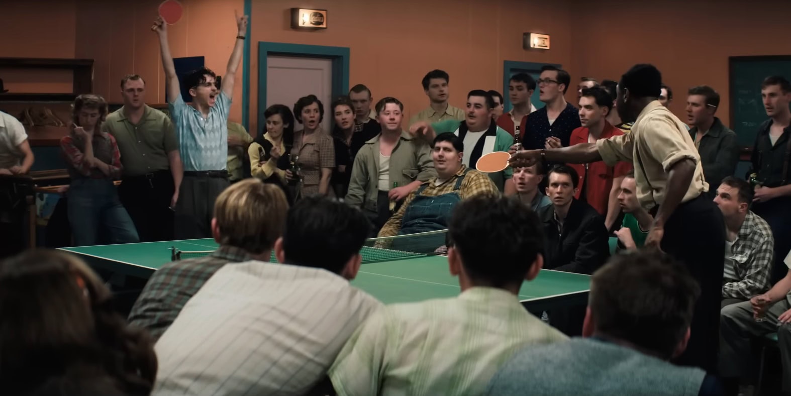 At the risk of sounding too hyperbolic, there is no way of knowing where this scumbag nuttiness is going next other than that Timothée Chalamet’s charismatic motormouth of an American table tennis powerhouse/tournament failure Marty Mauser will either get cocky, greedy, offensive, shamelessly selfish, self-absorbed, overly prideful, snarky, or some variation of too far ahead of himself, fudging up his poorly conceptualized cons to secure funding to, one year later after a loss and blow to his ego, compete in the same tournament against the Japanese athlete crowned champion contending for something bigger than himself in the wake of World War II. Marty (loosely based on the hustles of table tennis athlete Marty Reisman, although taken with such liberties that there are full-on car chases, shootouts, and explosions in this sports story) is also the type of person who probably can’t even conceive of the idea of other countries, centering himself against the world with enough dumb confidence to fill an ocean.