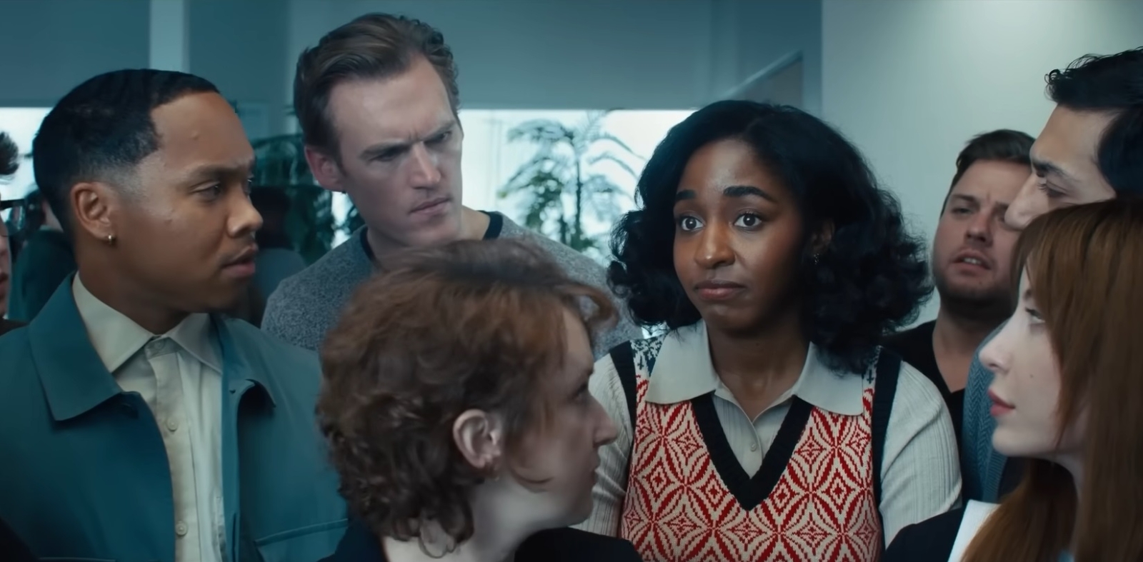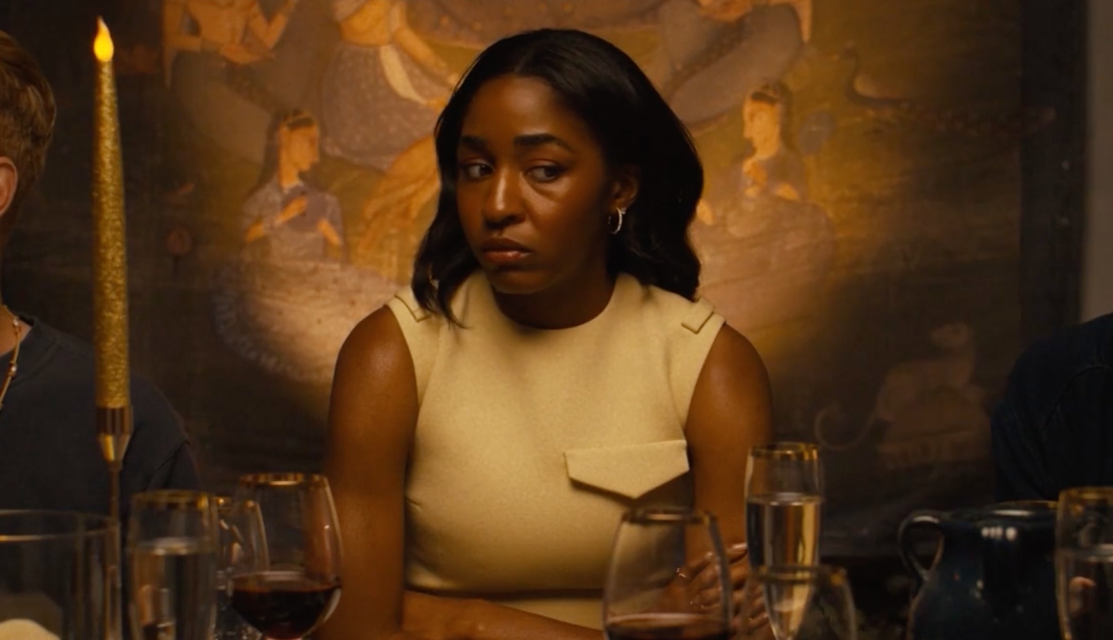 Ayo Edebiri’s Ariel is scratching and clawing her way to a big article surrounded by male peers who repeatedly take the most interesting assignments for themselves. The difference here is that Ariel isn’t caught up in the music but is much more fascinated by Moretti’s (John Malkovich) Levelist cult, presumably much like everyone watching this movie will be. One of her friends also suggested that diving into an unorthodox experience would give her writing more perspective and thus make it more compelling. By this logic, the film seemingly agrees that the cult and stories behind Moretti’s longtime, most dedicated worshipers is where the intrigue is, yet still succumbs to trying and failing to entertain through the singer’s shallow music. It’s a series of confused contradictions.