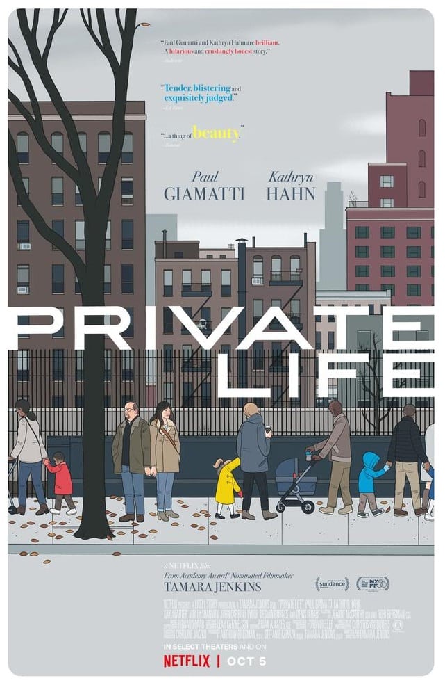 There’s a saying that having a child is the solution to all relationship woes, so the interesting thing about Private Life is that, from what we are told, this was once a happy couple and a successful one at that with Richard (Paul Giamatti) and Rachel (Kathryn Hahn) achieving notoriety as respected artists (theater director and writer, respectively). Problems didn’t arise until tackling this dream, and part of the film deals with them attempting to own up to responsibility for waiting and pursuing other passionate projects. For those wondering, adoption also seems to be out of the question as they are deemed unqualified due to the graphic sexual paintings proudly displayed over the walls of their home, and they also probably just would prefer other options due to the uncomfortable nature of the entire endeavor. As Richard says at one point though, nothing about the couple’s road to pregnancy has been natural and things likely won’t ever start.
