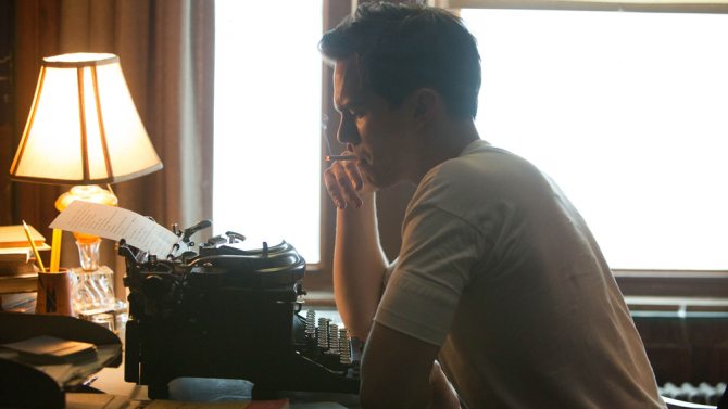 Rebel in the Rye has one of the least involving and cheapest looking World War II sequences I have seen in quite some time. Not every film has to be Dunkirk, but it almost feels like unintentional parody as Salinger narrates the horrors of war while all we see are some heavy blue hues and some bloodless death. It’s roughly five minutes of the 105 minute running time, and once it’s over and done with we’re supposed to buy that Salinger has harrowing PTSD symptoms. Whit strongly encourages Salinger to flesh out his most prolific character into a full-length novel, broadly expanding his horizons from just simple shorts, except the film fails at displaying how the war could influence and/or hinder his progression and motivation. Instead, every scene showcasing Salinger putting words to some paper is accompanied by him lighting matches in darkly lit rooms, broodingly standing around. It’s not very engaging and furthermore, just poor direction.
