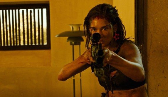 The issue here is you’ll have to buy into Jen’s blistering rise like a phoenix from the literal ashes of primal devaluing. Empowerment comes in the form of bloody, eye-gouging, rifle-scoped murder; her survival a product of burning the prickly shrub she’s impaled on post-plunge (clean puncture front-to-back). No rations, just a beer and peyote, zero backstories. Those in need of reason will be left stranded in this desert of retribution no matter how action-heavy and fulfilling Jen’s trial by gunsmoke may be. If you’re the kind of viewer who might point out how Jen’s cauterization tattoo should read backward (the embossed beer can logo brands an ascending bird with accompanying text on her stomach), expect a few “huh?” moments. How does she patch her back hole? Where are the pools of blood that pour from each body stored? Style sizzles and substance is borderline grindhouse, but the film’s flimsier narrative choices are left in the dust.