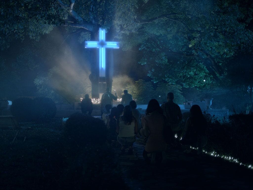 That isn’t to say it doesn’t have some extreme moments, but because of the slow burn in each story the inevitable gory ending never really leaves the audience in fear. Although to counter that – some of the violence is shocking simply because it develops the characters through monologues and intriguing conversations before the blood starts to pour. One scene in particular featuring a Motel proves to be an intense few minutes as the audience realises the significance of it. Although the violence in each segment is directed and shot well, it isn’t anything that horror fans haven’t seen before. Some of the visuals are interesting, like a neon lit crucifix surrounded by zombies with similarly glowing eyes. Another element the film manages to master quite easily is the transition between each tale. It feels seamless, and as one whole plot it’s kind of enjoyable, but each individual story doesn’t feel fleshed out enough to leave a lasting impression – and neither do the majority of the characters. It could have easily done with an added 30 minutes on the runtime.