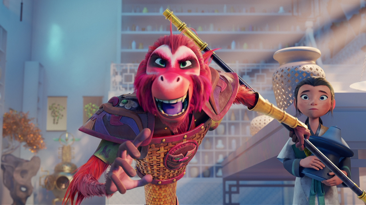 Meanwhile, a sea dragon (amusingly voiced by Bowen Yang, who also performs a catchy villainous musical number) wants to reclaim that stick and bring forth to the world the deadly storm. He also enlists a young girl, Lin (Jolie Hoang-Rappaport), to pose as a helpful assistant to Monkey King, manipulating her way into retrieving the stick and giving it back in favor of saving her land and crops.