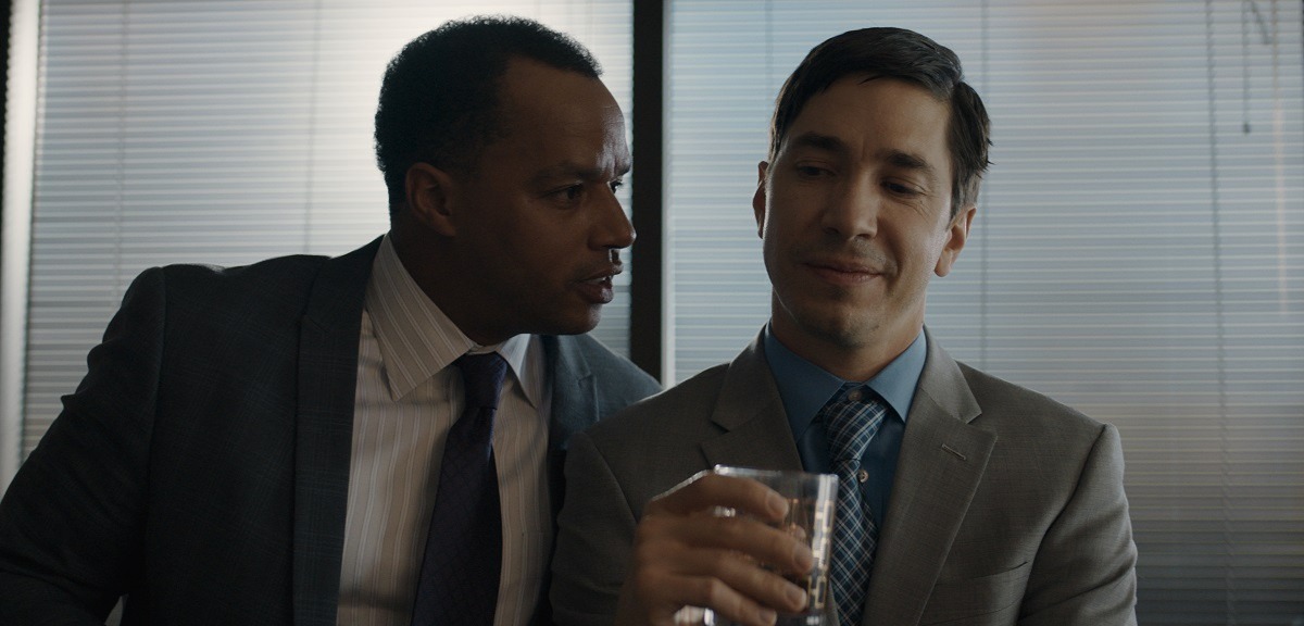 Justin Long stars as Frank, a hypocritical law firm employee that has no issue sifting through file after file to place the blame of the average person’s financial woes on themselves for making irresponsible decisions such as purchasing new technology, all while openly admitting to his wife that he used some of their own funds to unnecessarily buy a 4K television set. If you are looking for an interesting marital dynamic here, keep looking, as Frank’s wife simply exists here to harp on his immaturity in excess to the point of incessant nagging, swiftly undoing any semblance of an actual character at all. She’s the stereotypical significant other that never shuts up, and as you can imagine, it’s a disappointing decision that doesn’t add anything to the hectic series of events Frank finds himself deciphering.