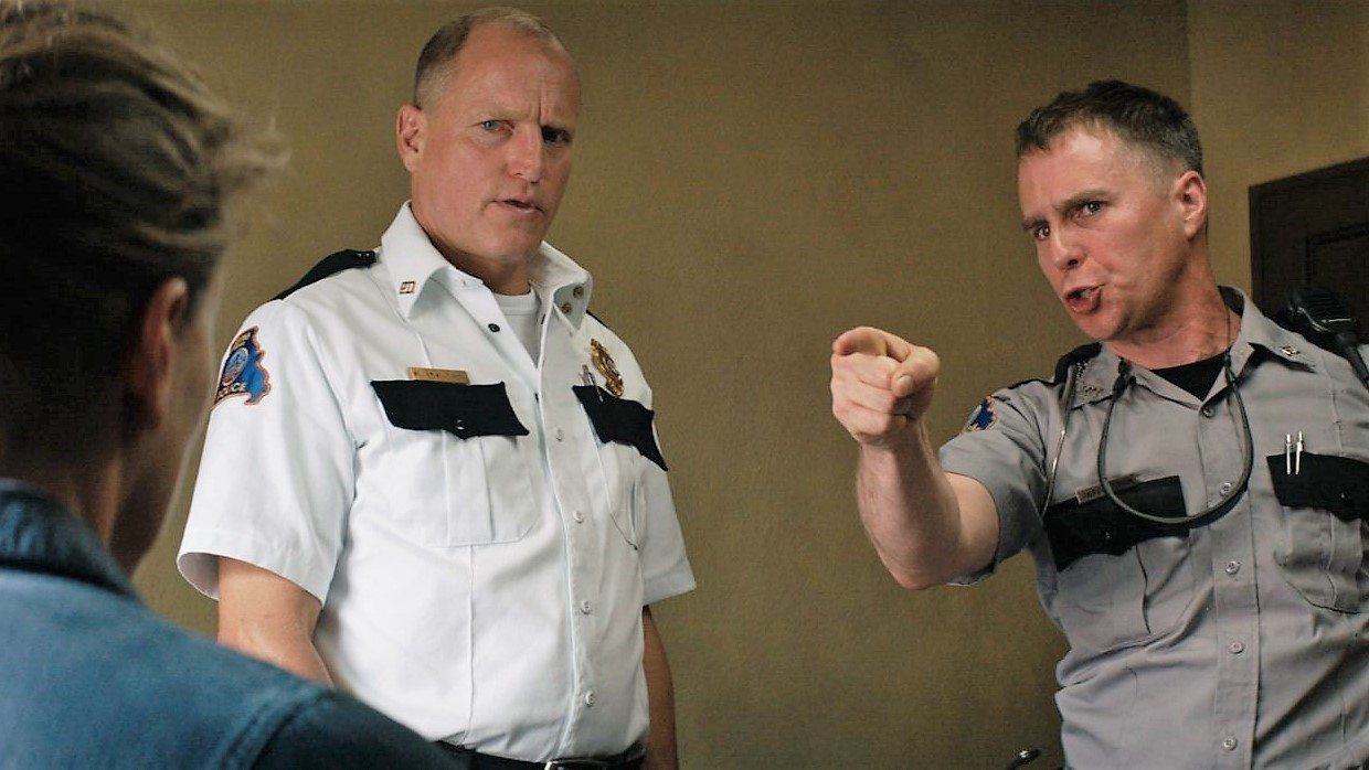 Three Billboards boasts both an exceptional cast (with several McDonagh regulars) and exceptional casting. Returners Woody Harrelson and Sam Rockwell are a brilliant police double act as Chief Willoughby and Officer Dixon, respectively. Harrelson is amiable as ever as the person with whom the buck stops (which the billboards make perfectly clear) – he may not be the most effective policeman, but he’s hurt by Mildred Hayes’ anger and disappointment. Rockwell is even more ineffective as Dixon is a small-minded, idiot cop, but it’s a role where he really shines.