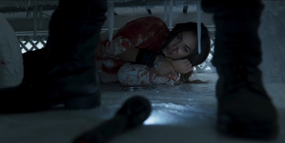 Megan Fox is still not necessarily a good actor per see, but she makes up for dialogue limitations (some of her line readings here are rough) with a ferocious survival instinct despite immense vulnerability and a tiny stature that certainly doesn’t help having to lug a corpse around with her everywhere she goes. For some inexplicable reason, there is also a necklace so tight around her it doesn’t come off. There is a physicality to the role that she excels at, especially when more danger comes her way. It’s also pleasant that Emma is reasonably intelligent, attempting every logical thing in the book to free herself. In other words, the script from Jason Carvey is playing to the strengths and limitations of Megan Fox, pulling her in the direction of a performance that plays off of frigid weather, resiliency, and hide-and-seek home invasion.