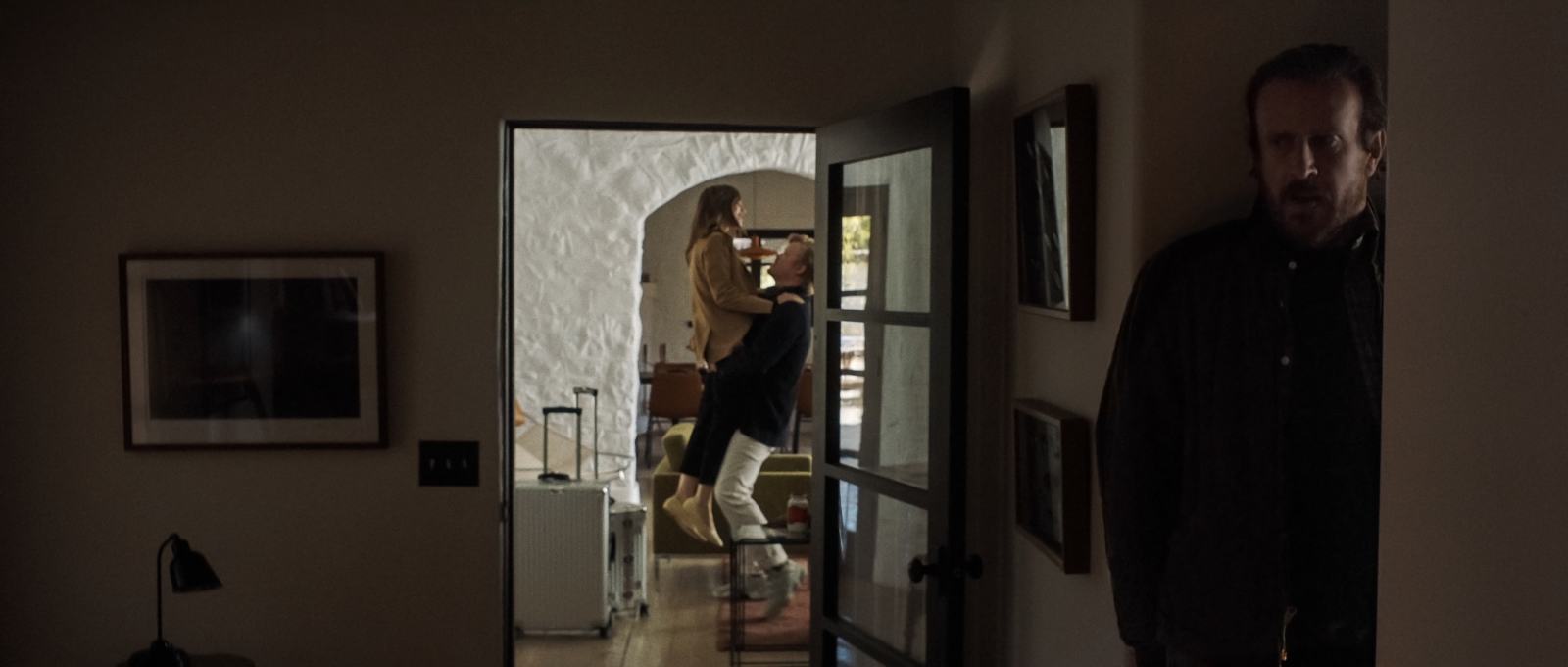 Regardless, the unexpected arrival of this business mogul and his wife (Lily Collins), sincerely passionate regarding charity work, throws a wrench into whatever the perpetrator had planned. By the looks of it, he’s just enjoying the luxurious residence before looting whatever valuables he comes across during a sweeping raid exploring the nooks and crannies of every desk and drawer. While hiding from the married couple, it’s also made intriguingly clear that the rich husband is, for lack of a better term, a raging self-centered asshole that demeans everyone around him, including his wife.