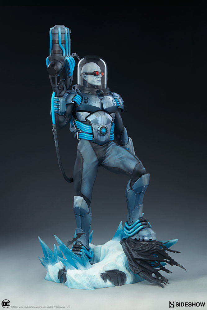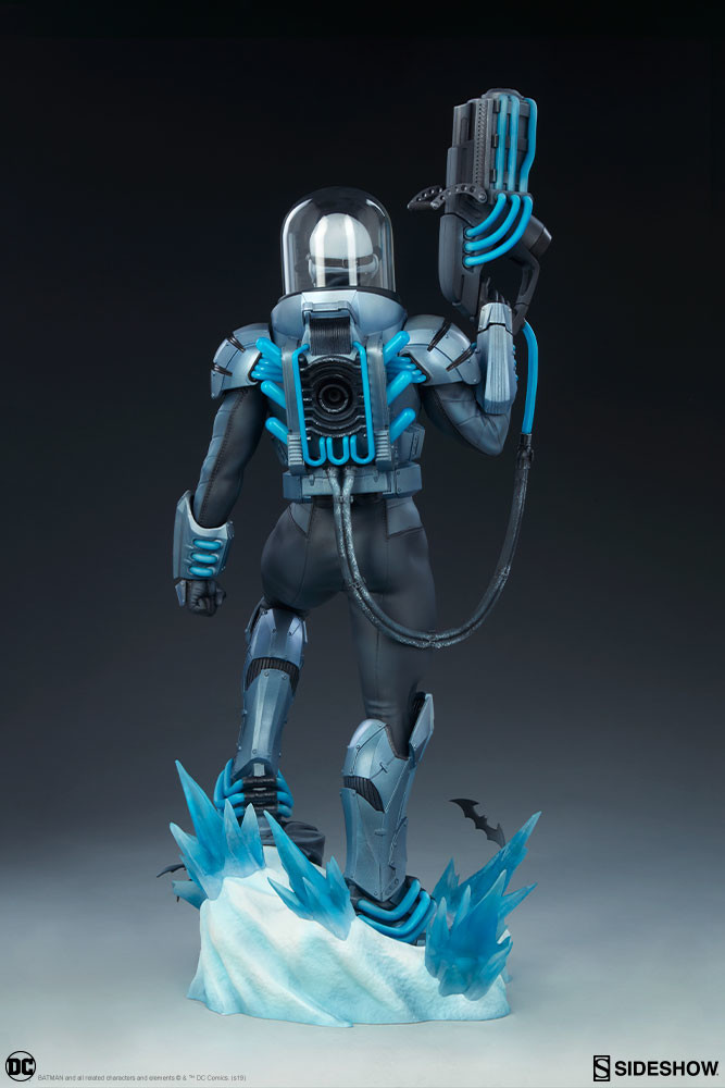 The Mr. Freeze Premium Format™ Figure measures 24” tall on top of a frostbitten laboratory base. As Batman’s below-zero foe, Victor Fries has his cryogenic gun prepared to give the Dark Knight a cold reception. Jagged blue ice crystals protrude upwards from the snowy scene, which features the tatters of a black cape and a batarang below Freeze’s boots.